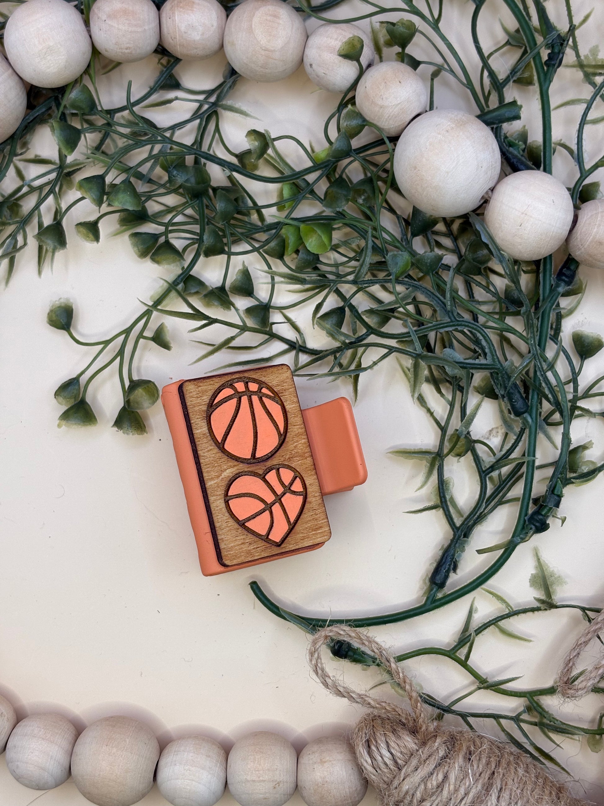 The Basketball Mini Claw Clip by PepperJack Designs is a delightful accessory that combines functionality with a playful spirit. Crafted from lightweight wood, this charming clip is not only handmade but also hand-painted, ensuring each piece is unique. It features two adorable basketballs—one shaped like a heart and the other a classic circle—making it a perfect addition for basketball enthusiasts or anyone looking to add a touch of fun to their hairstyle.