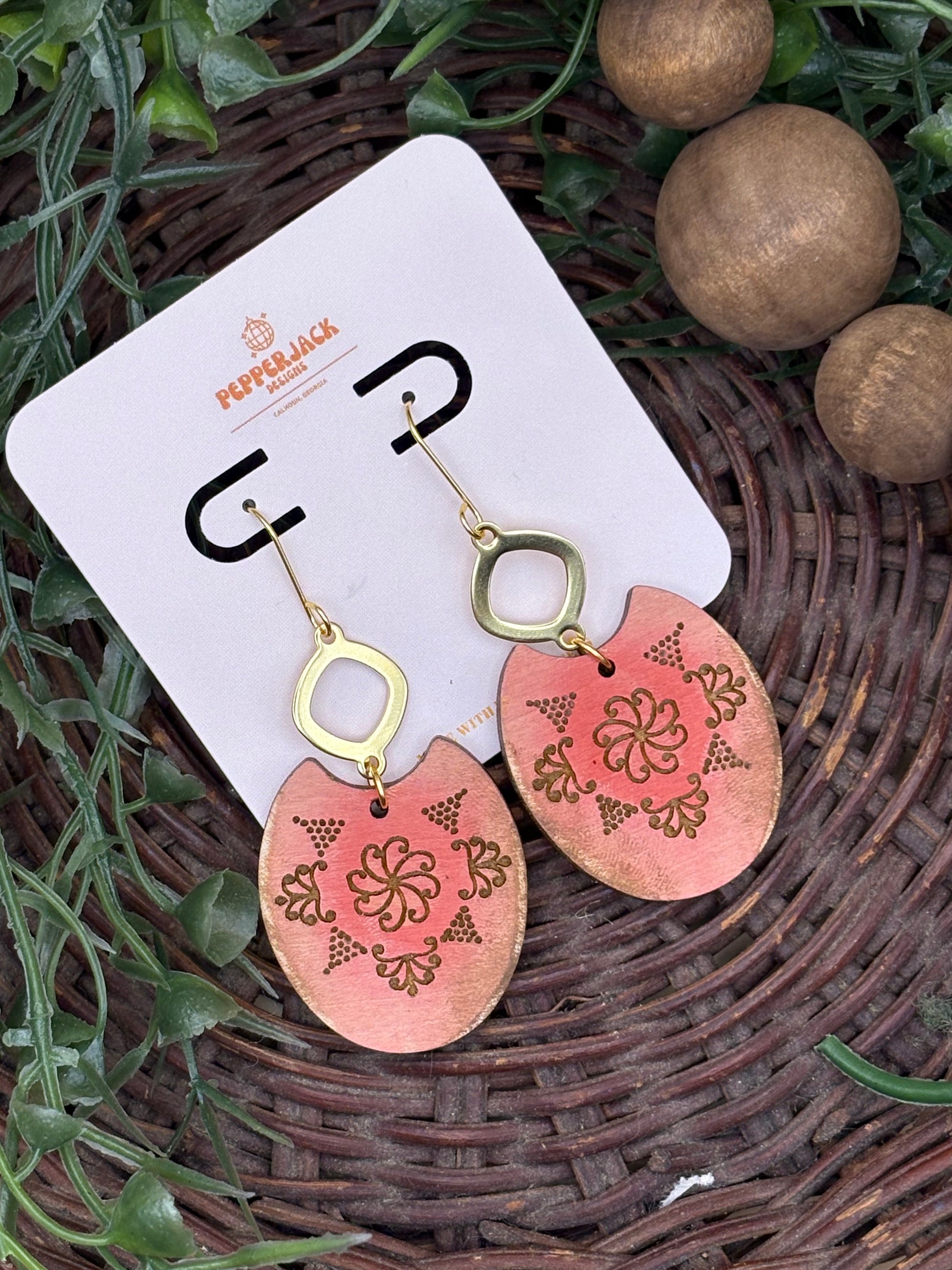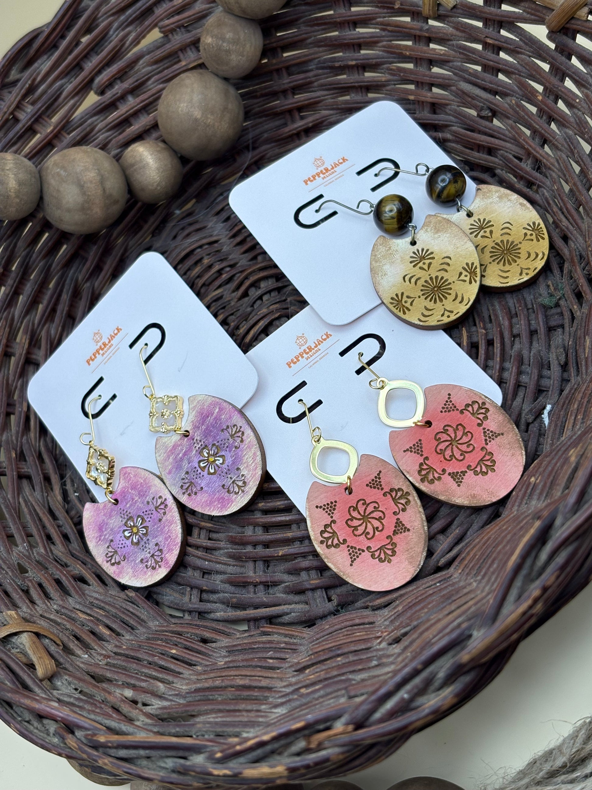 Made from lightweight wood. Handmade and hand painted. Available in 3 styles - The first is a yellow/cream with a drop bead hardware, the second is a purple/pink with an opal style drop hardware, and the third is a red/orange with a brass diamond shaped drop hardware. All hardware is made from medical grade hypoallergenic stainless steel. These earrings are the perfect accessory for any occasion and will add such a cute boho flair to any outfit!