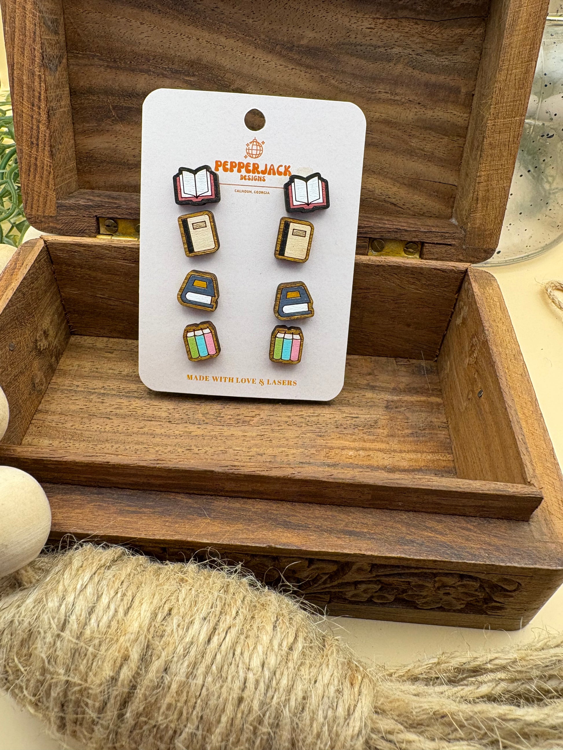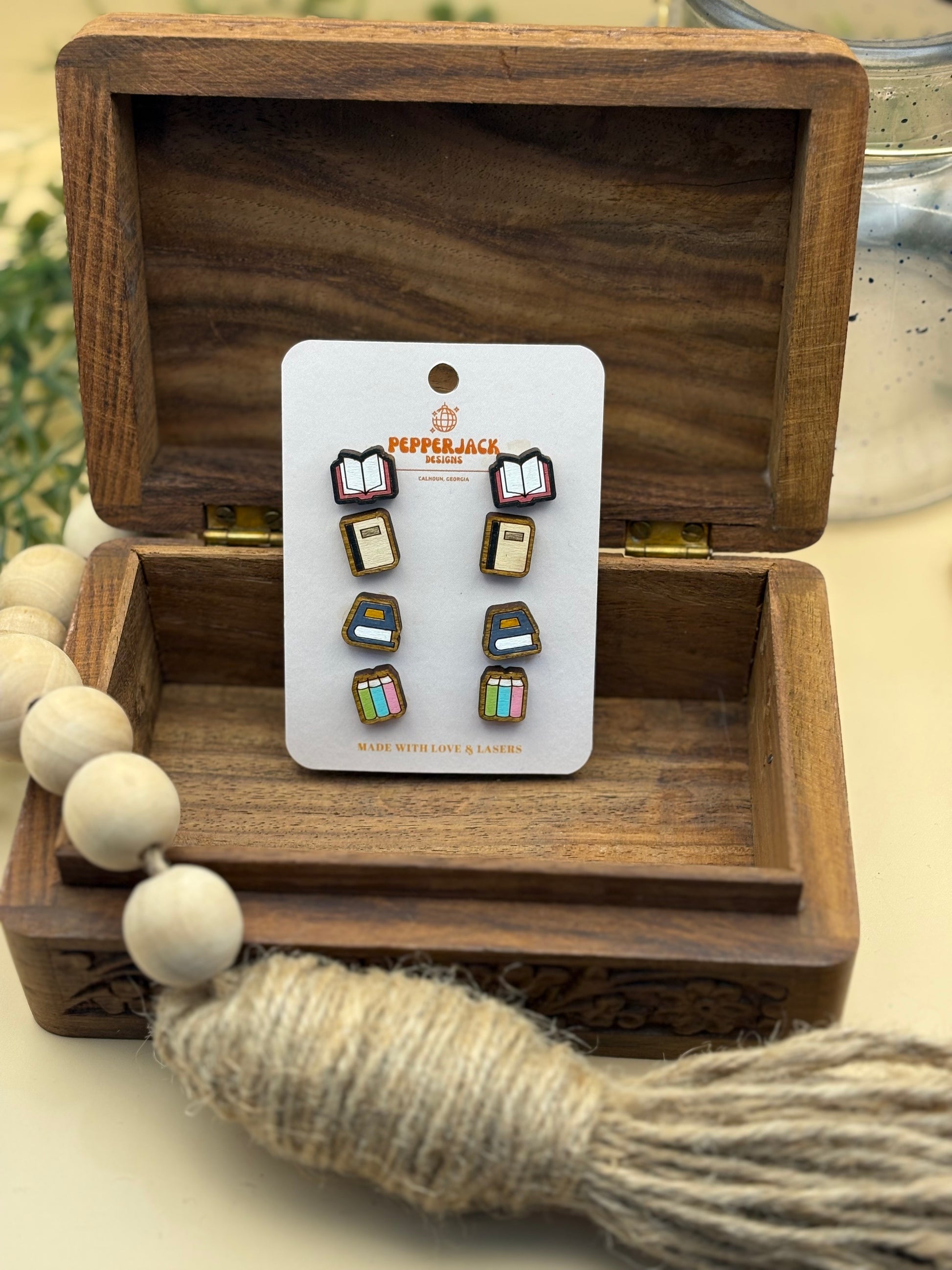 PepperJack Designs presents the Book Lover Stud Set 2.0, a delightful collection of four stud-style earrings that celebrate your love for reading. Each pair is meticulously handcrafted from lightweight wood, ensuring comfort and style for any occasion. These charming earrings are not just accessories; they are a statement of your passion for books. Perfect for gifting or treating yourself, this unique set adds a whimsical touch to your jewelry collection.