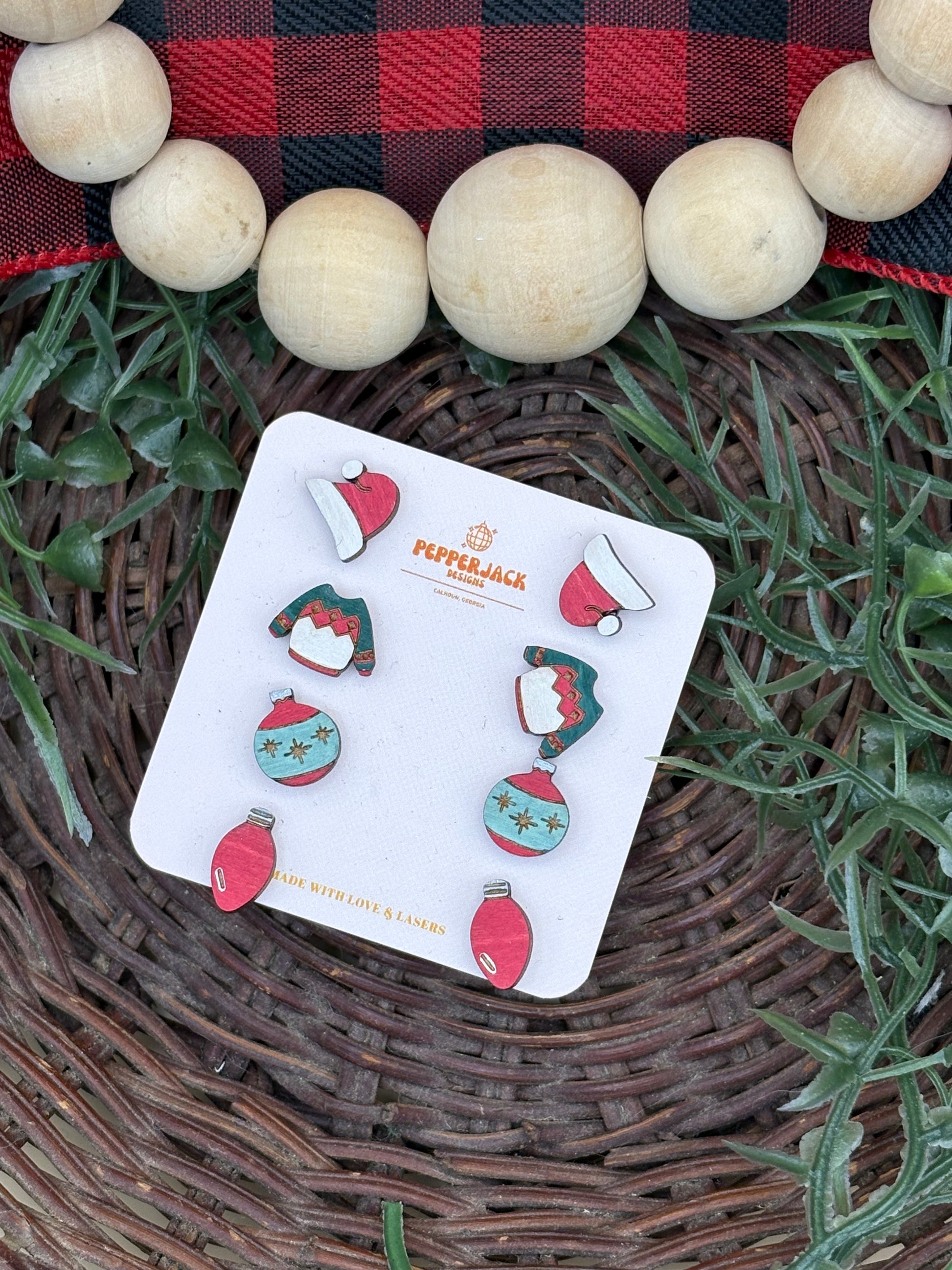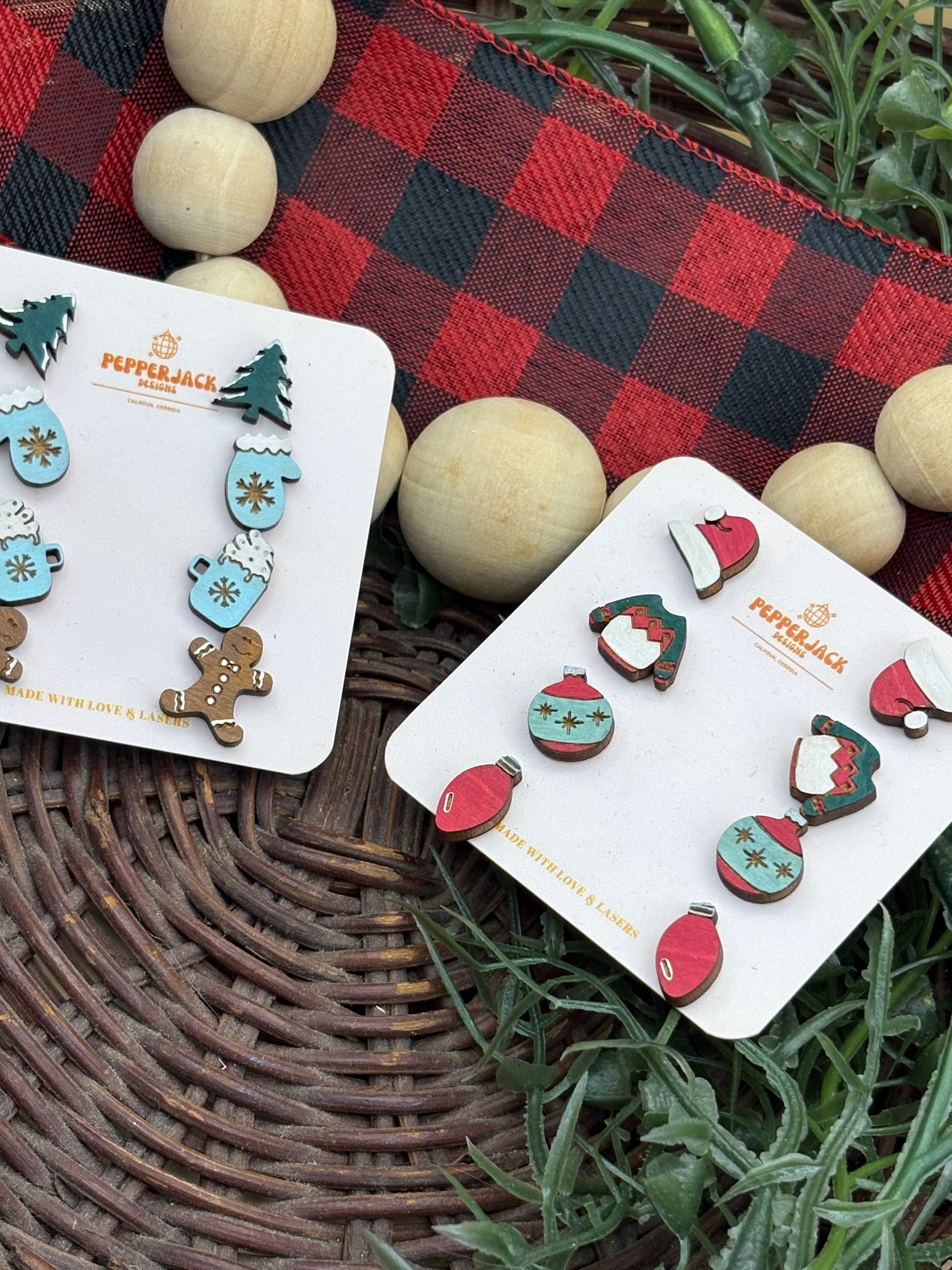 Made from lightweight wood. Handmade and hand painted. 2 different sets available - each set features 4 different pairs of earrings. The first set is reds and greens and features a set of Santa hats, a set of Christmas sweaters, a set of Christmas ornaments, and a set of Christmas lights. The second set is blues and greens and features a set of Christmas trees, a set of mittens, a set of hot cocoa mugs, and a set of gingerbread men.