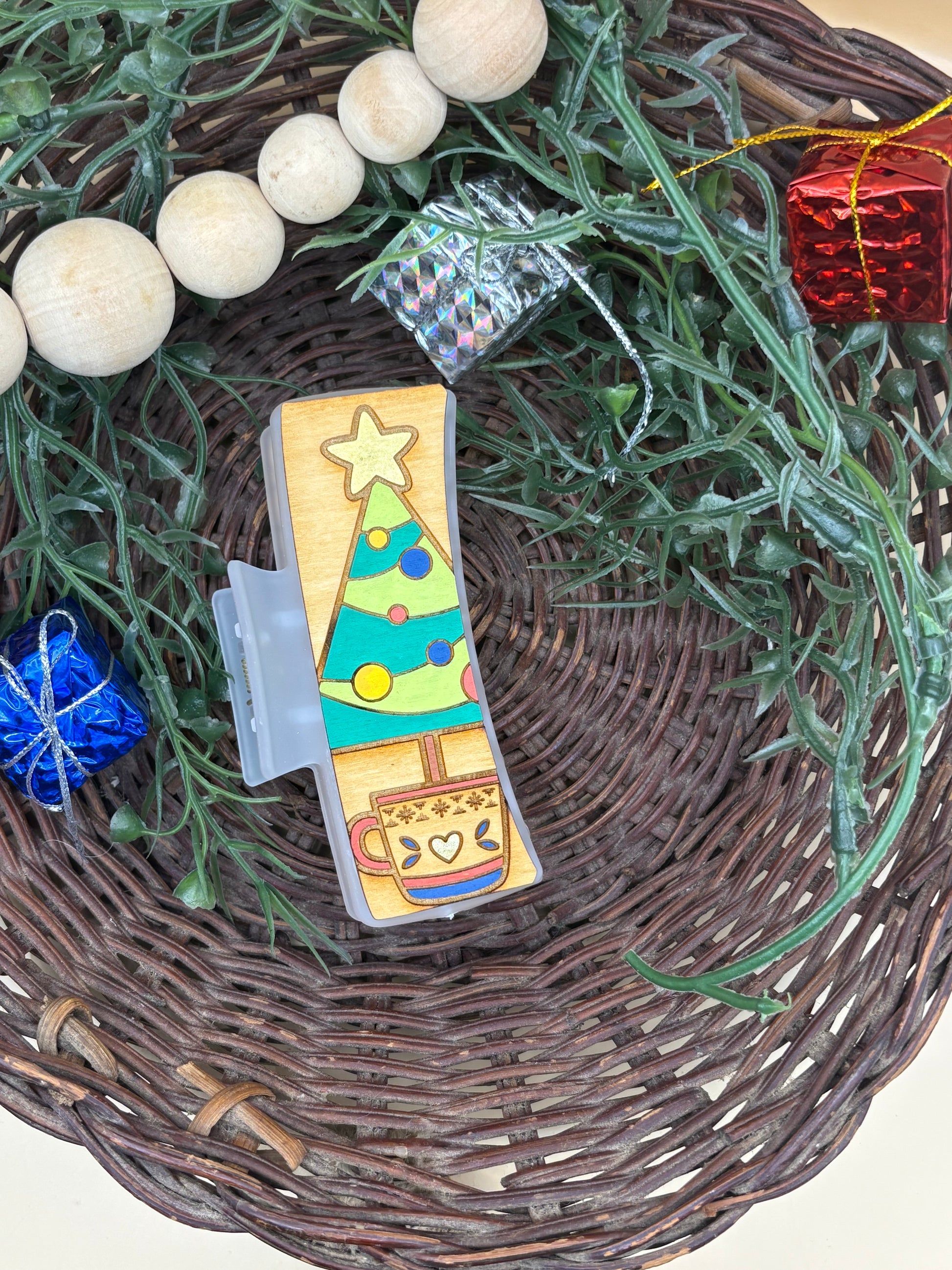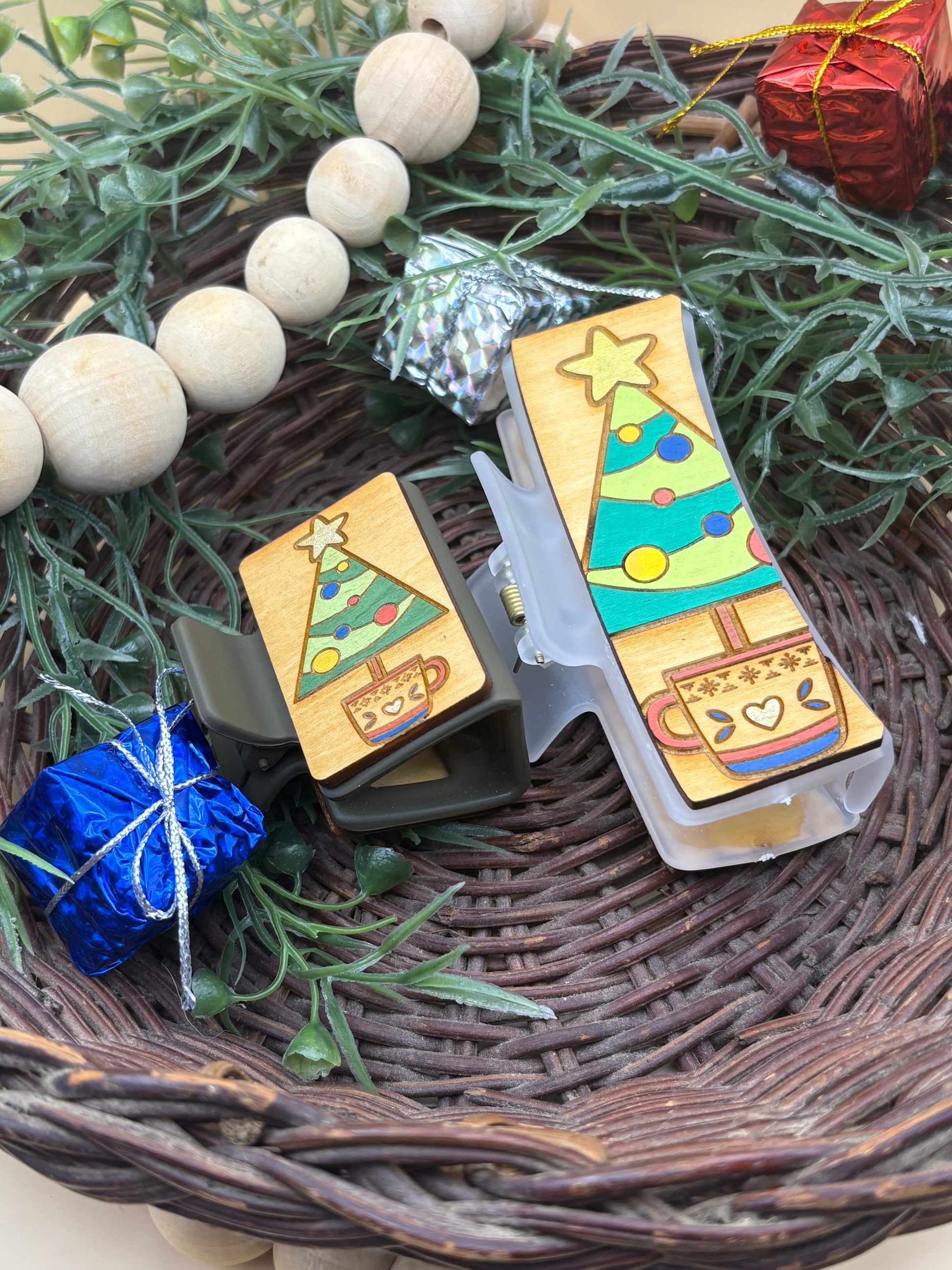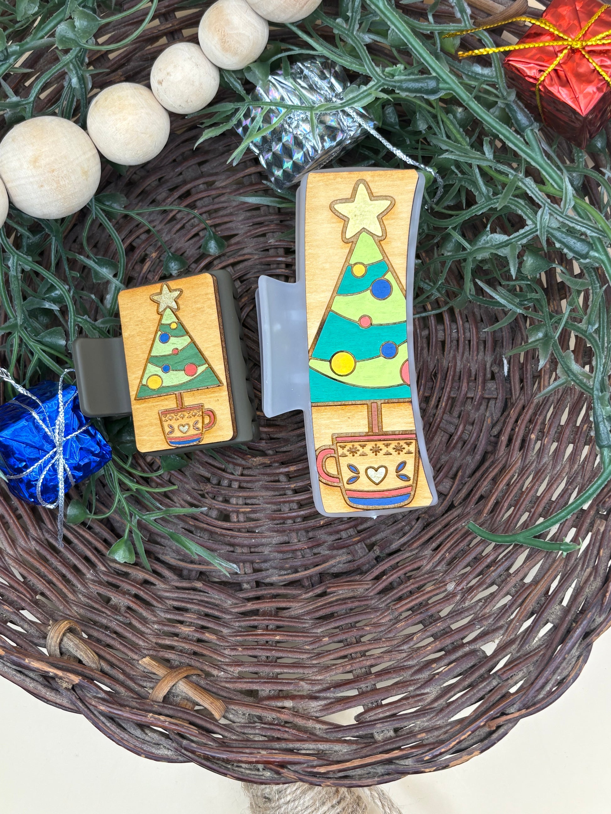 Made from lightweight wood. Handmade and hand painted. Features a cute geometric Christmas tree in a folksy mug. Perfect accessory for the holiday season!