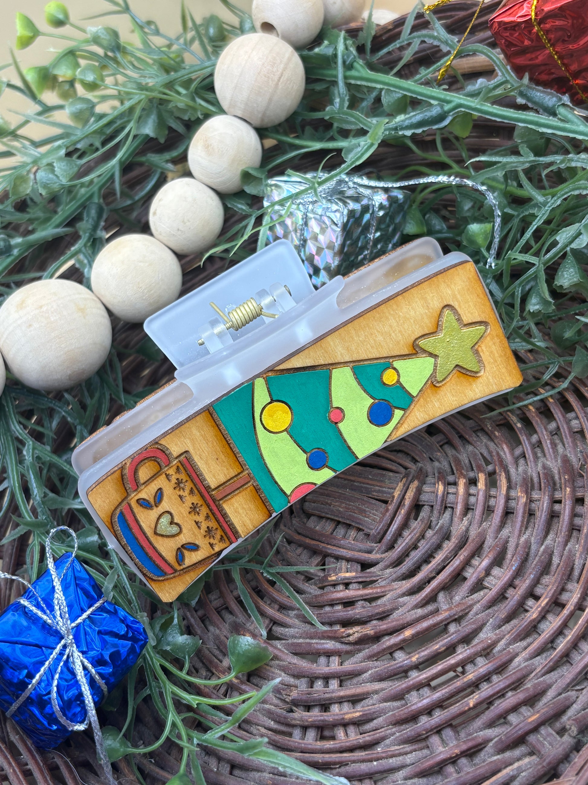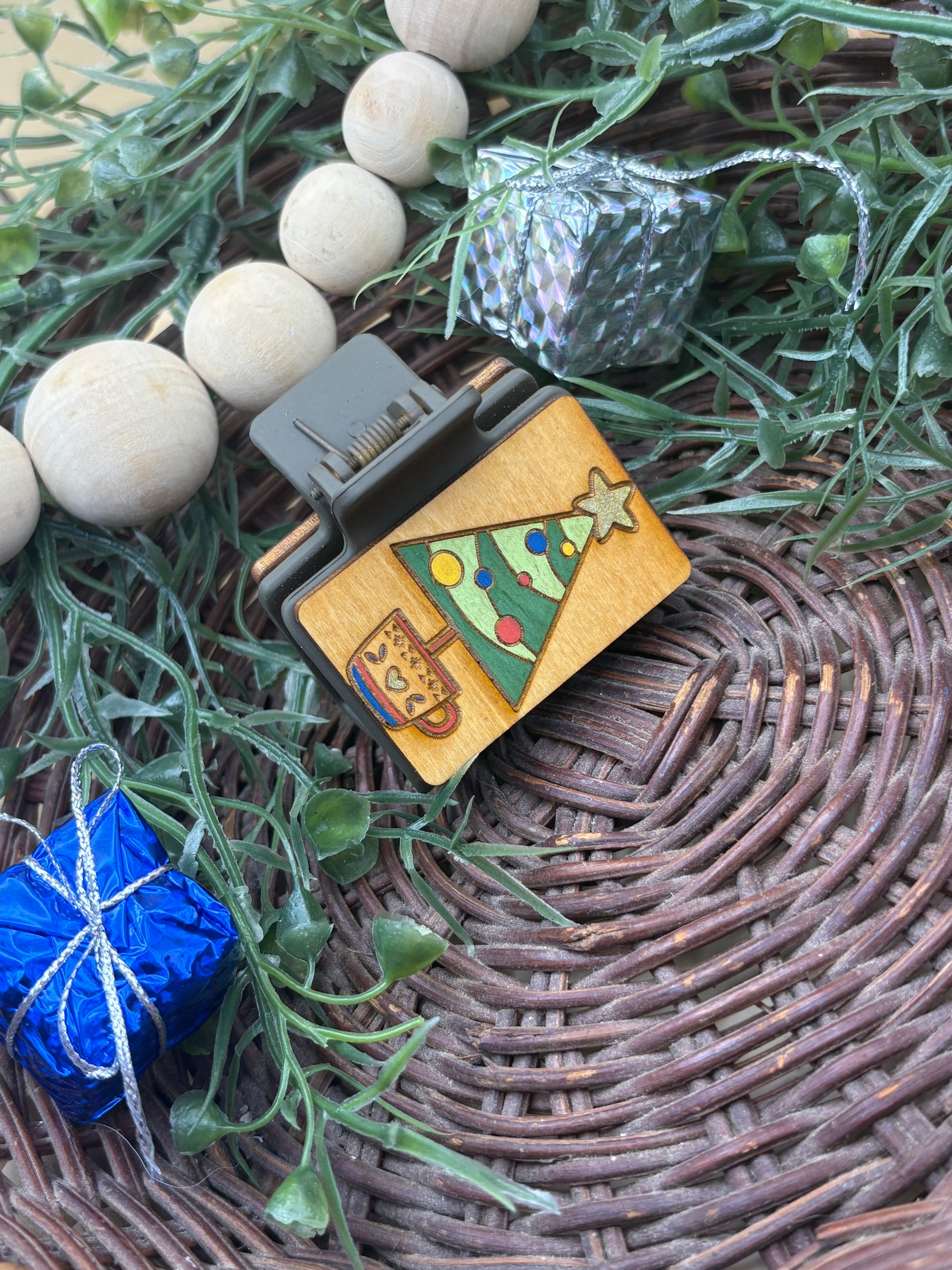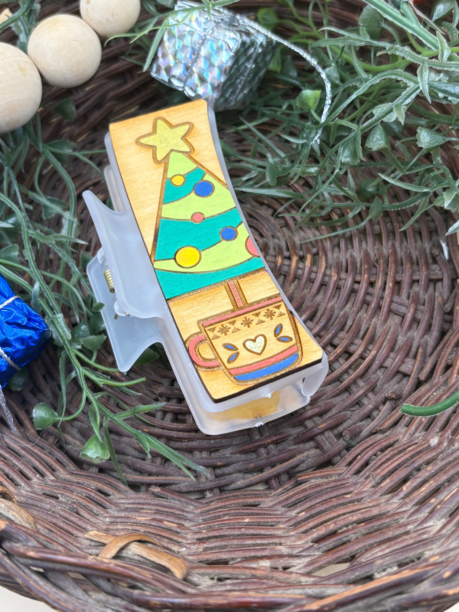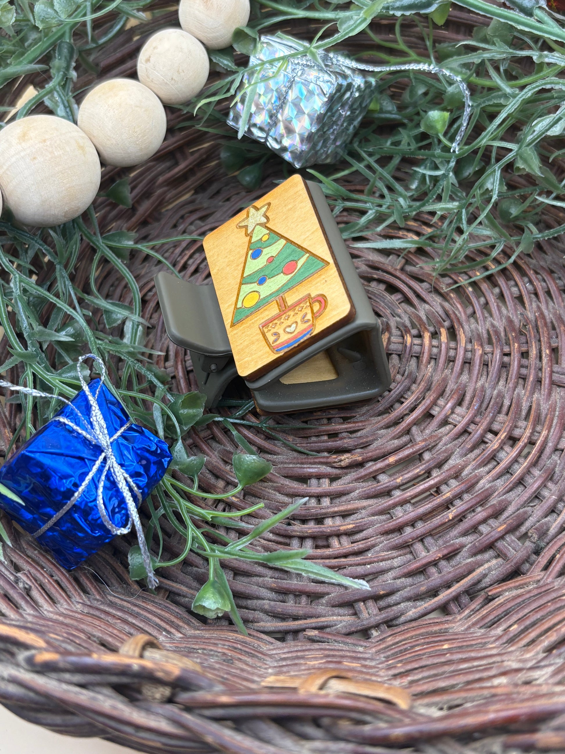 Made from lightweight wood. Handmade and hand painted. Features a cute geometric Christmas tree in a folksy mug. Perfect accessory for the holiday season!