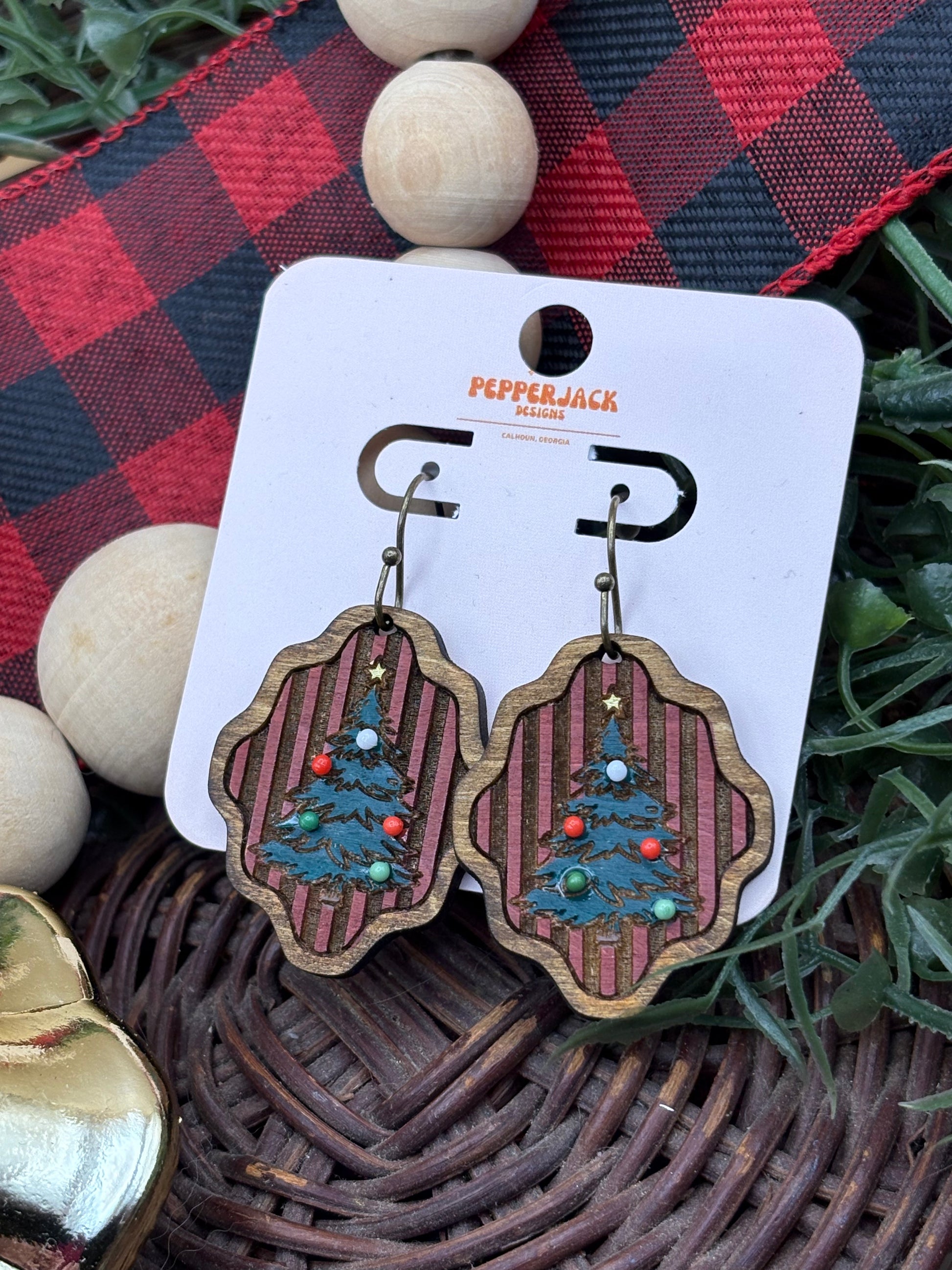 PepperJack Designs Christmas Tree With Stripes Earrings bring a cheerful, handcrafted touch to your holiday look. These lightweight wooden earrings are handmade and hand-painted, featuring a festive Christmas tree motif with ornaments secured in place using clear resin over a burgundy striped background. The finished pieces hang from hypoallergenic stainless steel hardware for comfortable everyday wear during the season. Their artisanal finish and vivid stripe detail make them a standout accessory for holiday parties, gift-giving, or seasonal outfits.