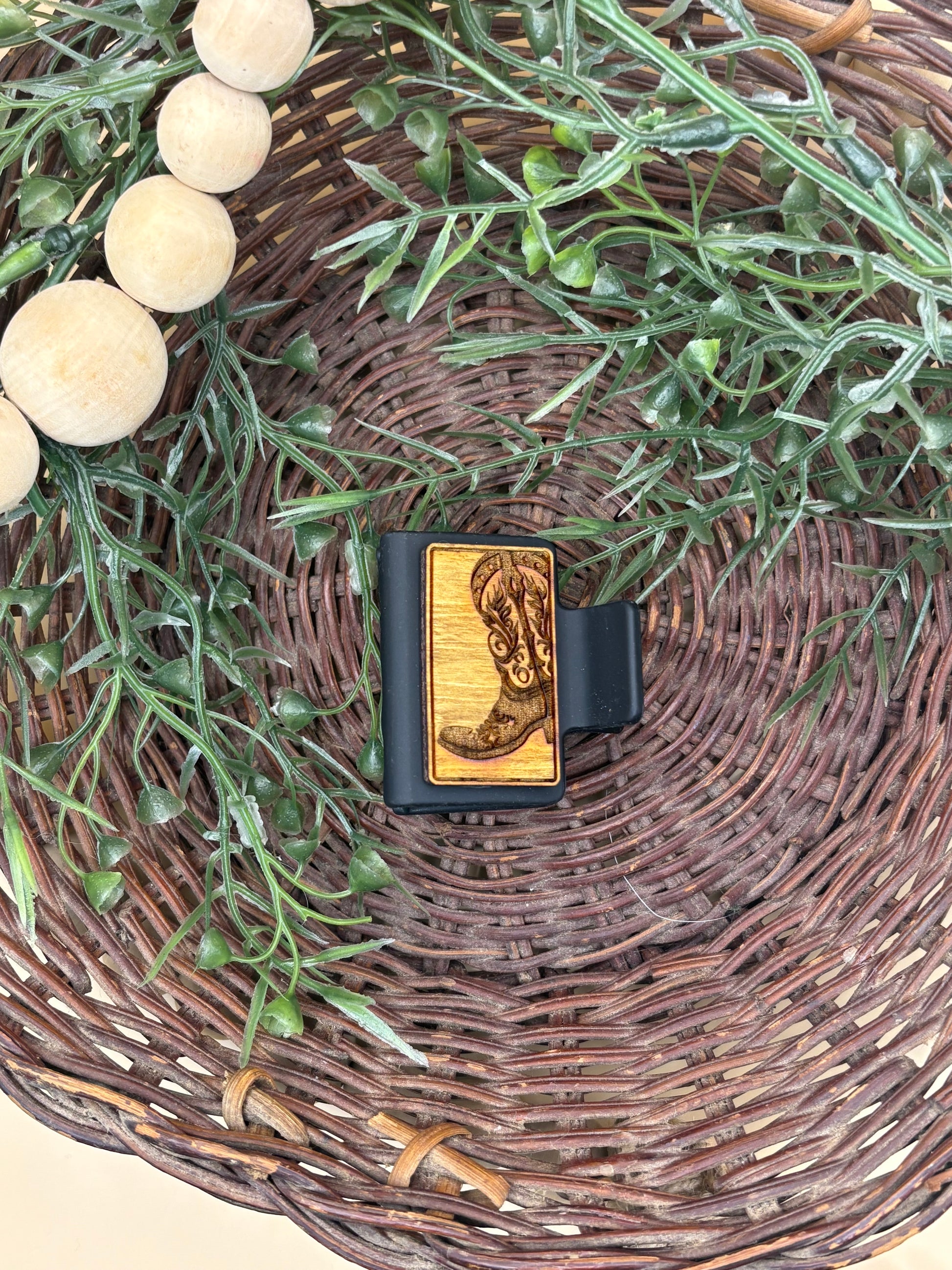 Cowboy Boot Mini Claw Clip from PepperJack Designs is a charming, lightweight wooden hair accessory crafted by hand and finished with a hand-stained patina. Designed for everyday wear, its engraved cowboy boot motif adds a playful, Western-inspired touch to ponytails, half-up styles, and casual updos. The compact mini claw size delivers a secure hold while remaining gentle on hair, and the natural wood finish creates a warm, artisan look that makes it ideal for gifting or adding personality to your daily routine. Handmade attention to detail and the subtle hand-stained coloration ensure each piece is unique—perfect for those who love handcrafted accessories with character