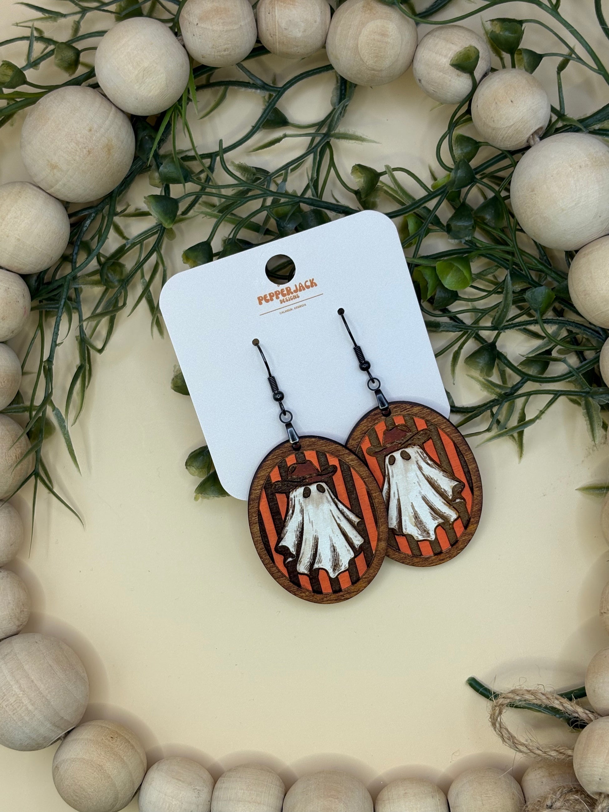 Introducing the Cowboy Ghost Vintage Striped Earrings by PepperJack Designs! These delightful earrings are crafted from lightweight wood, making them comfortable for all-day wear. Each pair is handmade and hand-painted, showcasing a whimsical cowboy ghost against a vibrant striped background. Perfect for adding a touch of fun to your Halloween or spooky season wardrobe, these earrings are sure to be a conversation starter. Embrace the spirit of the season with this charming accessory!