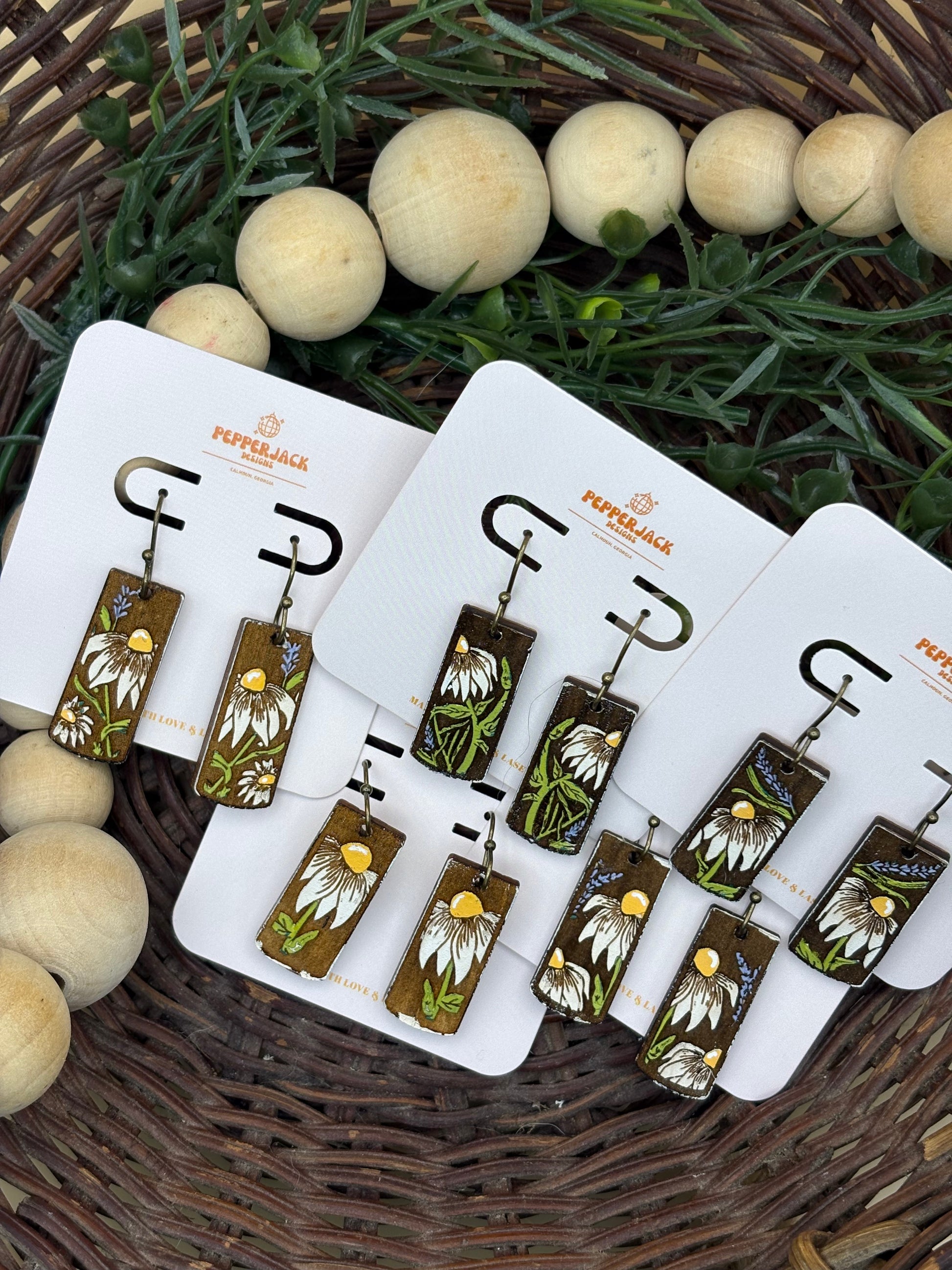 Made from lightweight wood. Handmade and hand painted. 5 different styles available. All styles are reverse engraved daisies in different positions.