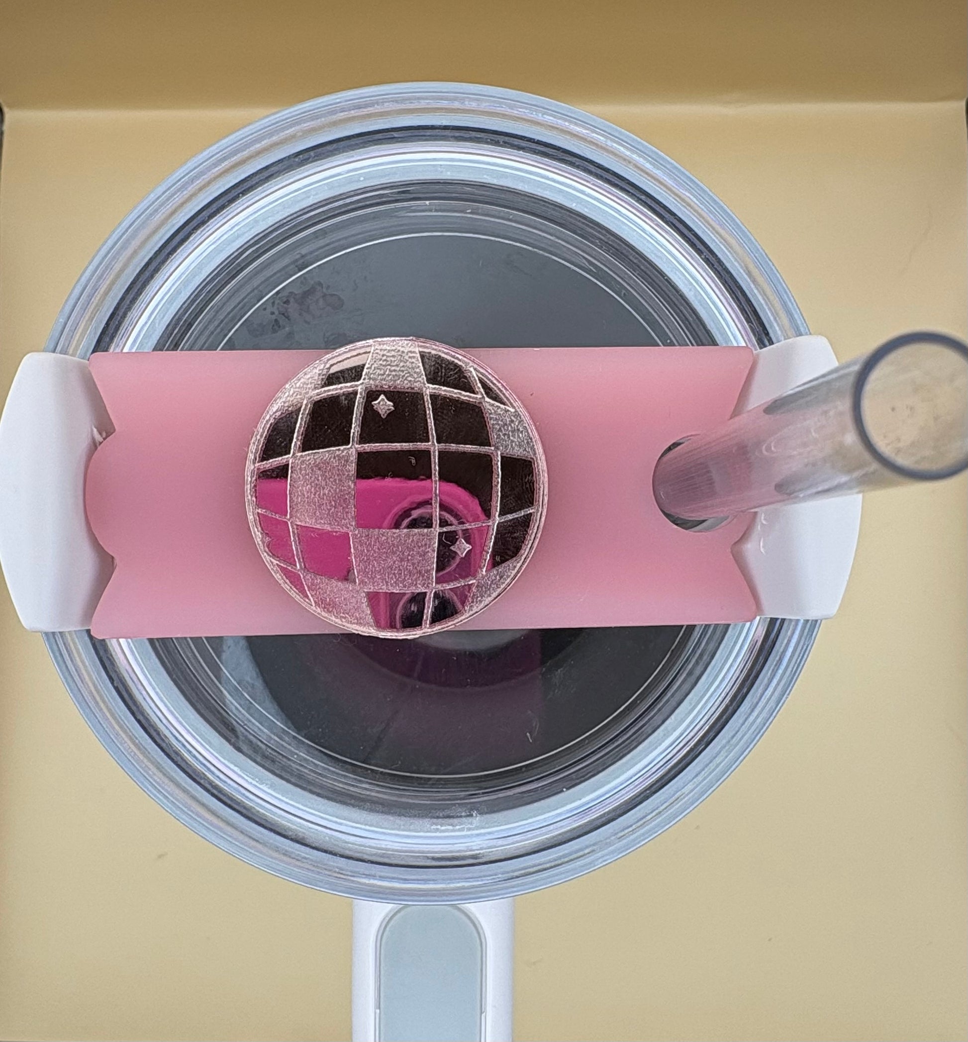 PepperJack Designs presents the Disco Ball 40oz Tumbler Topper, a dazzling accessory that transforms your tumbler into a sparkling statement piece! Crafted from 100% acrylic, this topper is designed to withstand dings and scratches, ensuring it remains as stunning as the day you bought it. The bottom plate features a frosted pink acrylic, while the disco ball itself shines with a beautiful rose gold mirrored finish. Perfect for adding a touch of fun and flair to your favorite tumbler, this topper is a must-have for any tumbler enthusiast!