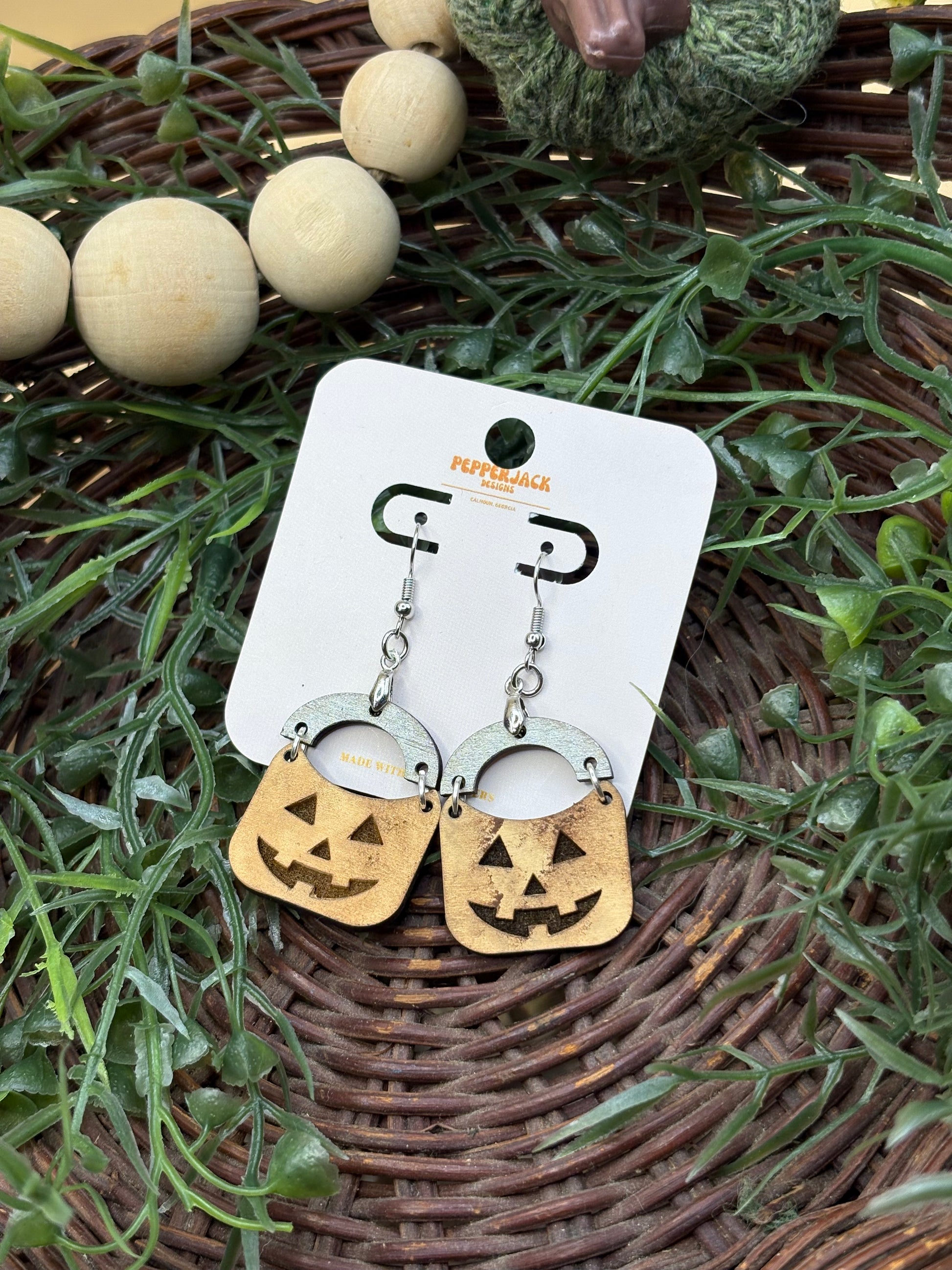 Halloween Candy Bucket Earrings by PepperJack Designs are lightweight, festive earrings crafted from wood for comfortable all-day wear during the Halloween season. Handmade and hand-painted, each pair features a charming jack-o-lantern bucket shape with a silver-painted handle that catches the light and adds playful detail. These earrings make a cheerful finishing touch for Halloween parties, trick-or-treating, or spooky-season outfits—pair them with cozy sweaters, costume looks, or everyday autumn styles to show off seasonal spirit.