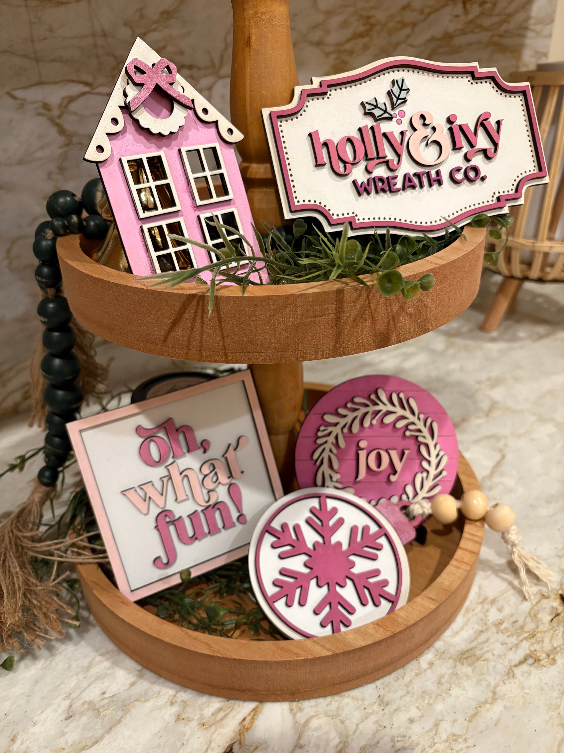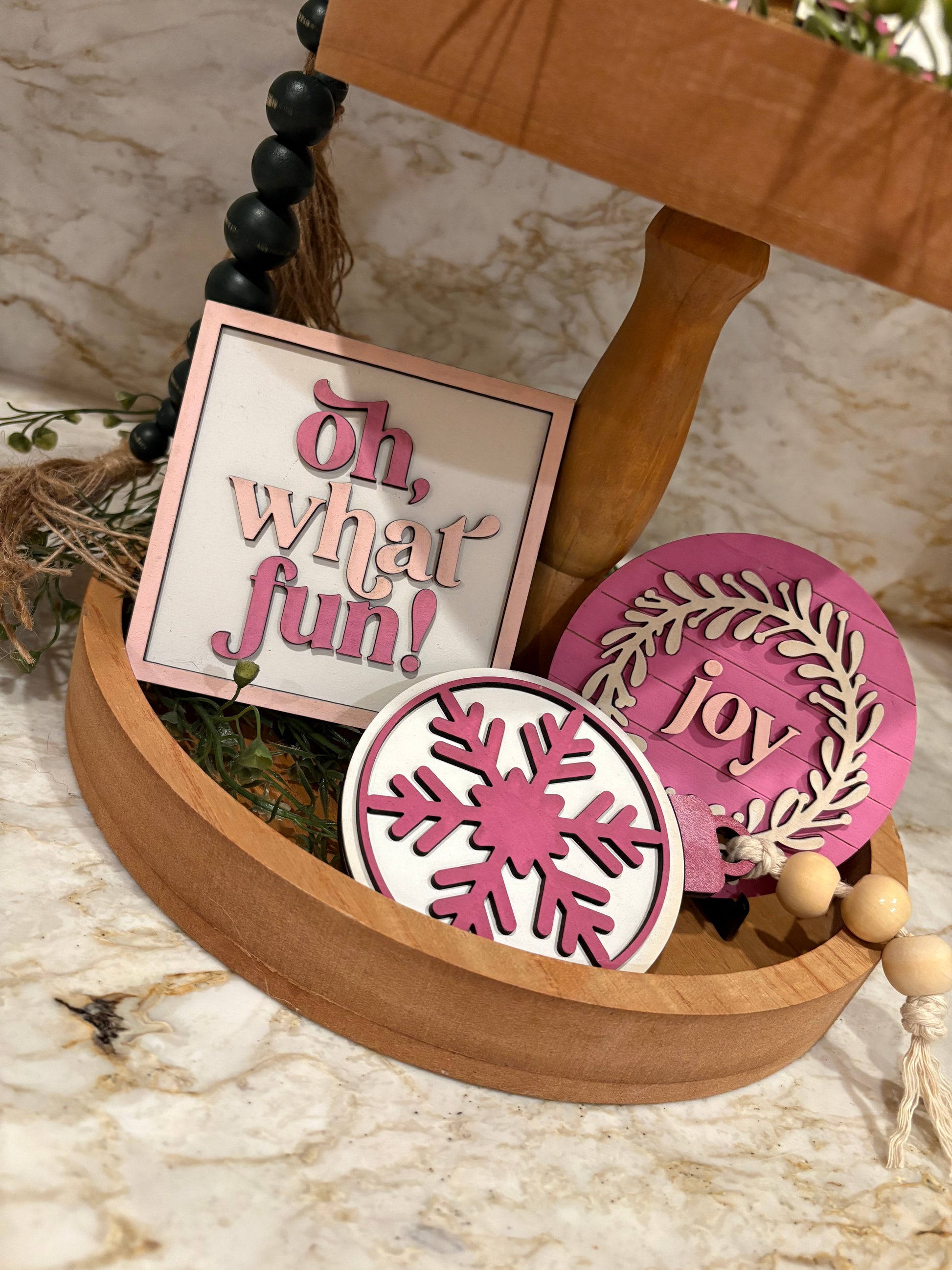 Handmade and hand painted. Features mini signs to decorate your tiered trays for the Christmas season! Pink and white color scheme.