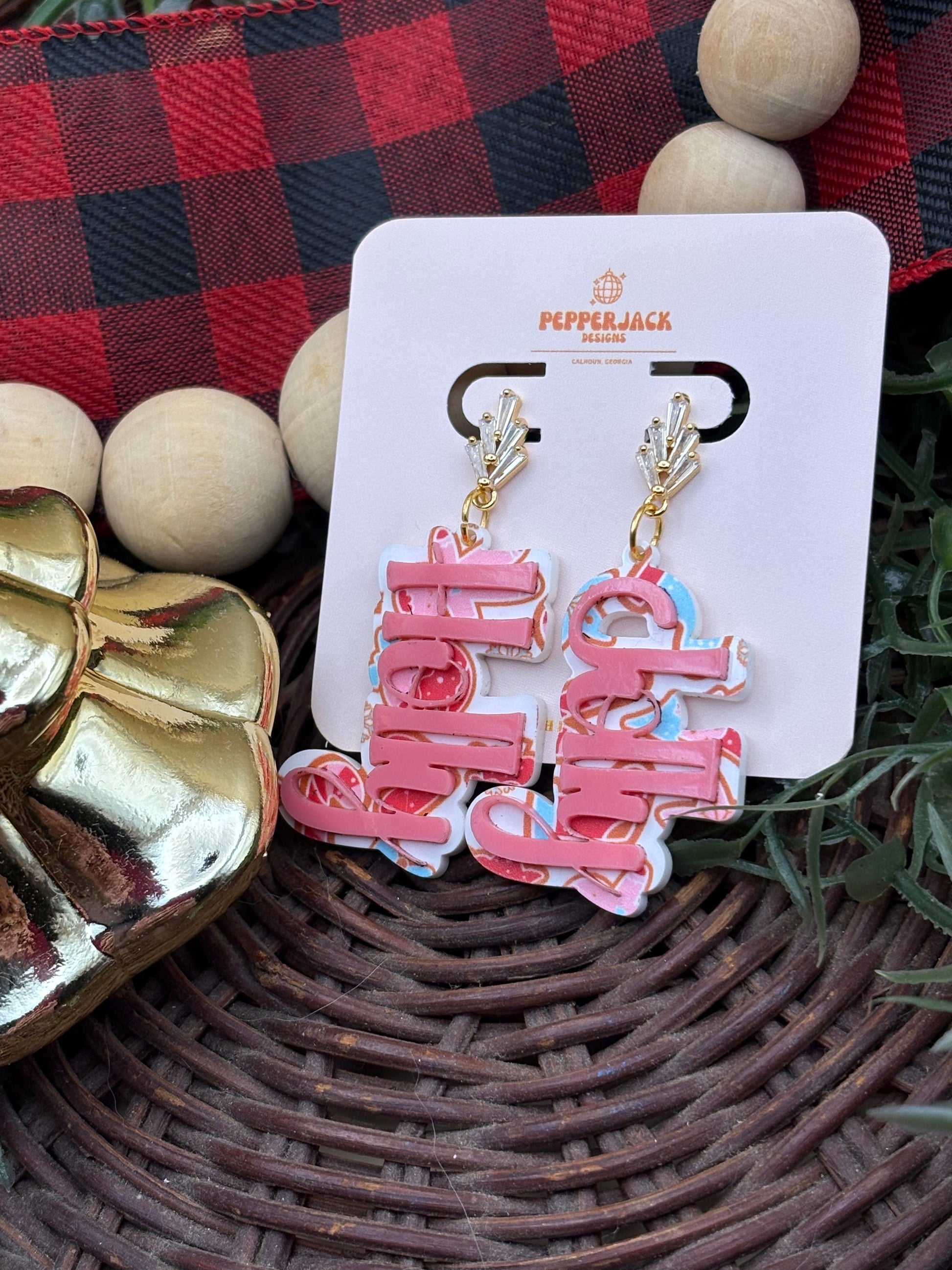Made from lightweight acrylic. Backer is made from patterned acrylic with pink, blue, red, and white that features stockings, ornaments, etc. Topper is made from pink acrylic and features the words "Holly Jolly". Features a jeweled stud top. Hardware is made from stainless steel.