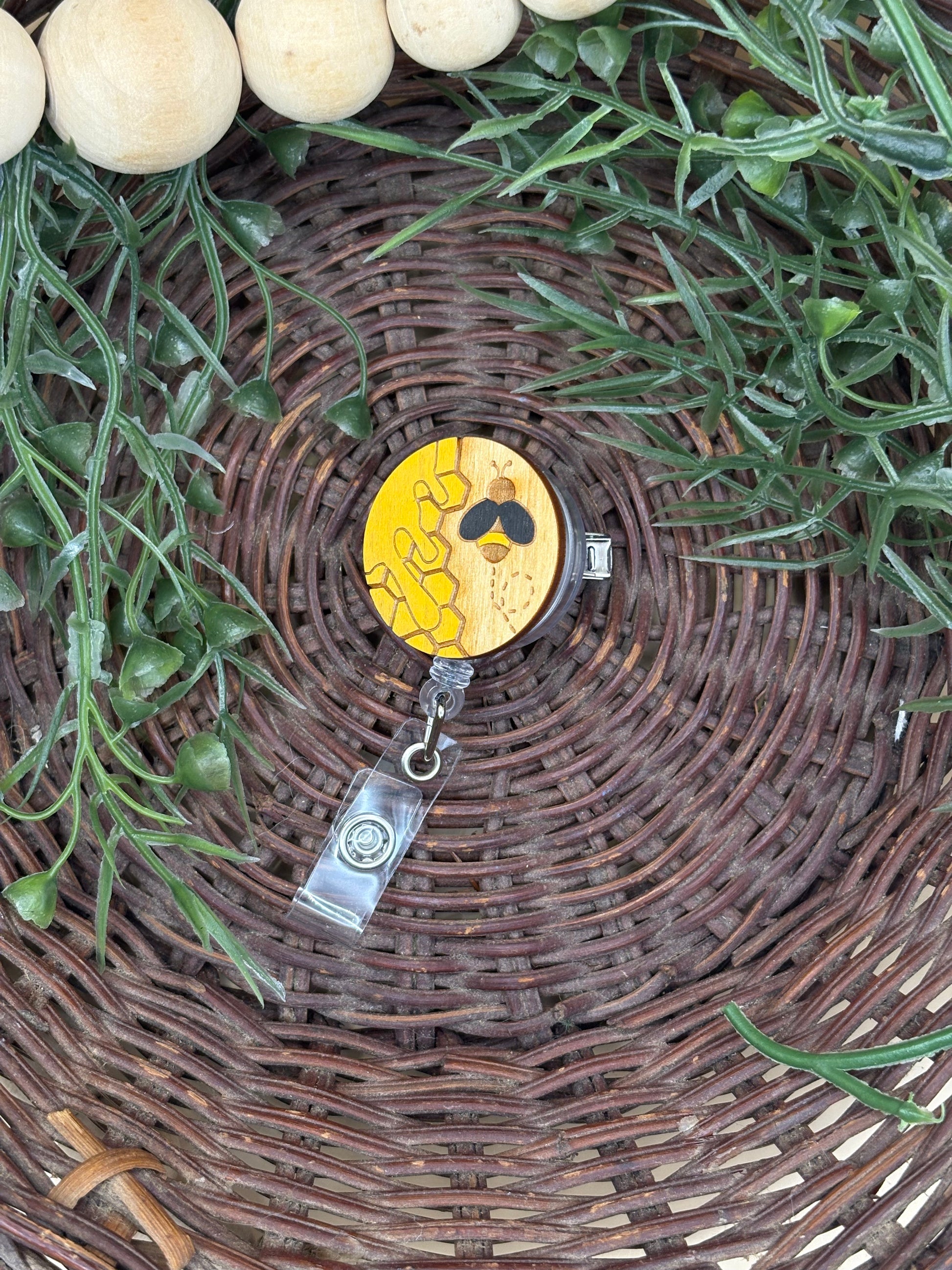 Honeybee & Honeycomb Badge Reel by PepperJack Designs is a charming, handmade accessory that brings a touch of nature-inspired flair to your everyday carry. Crafted from lightweight wood and hand painted, the reel features a detailed bee and honeycomb motif with a playful drip of honey. The retractable badge reel design keeps ID cards, keys, or small tools close at hand while staying neatly contained when not in use. Easy to attach to belt loops, handbags, or backpacks, this cheerful badge reel blends practical utility with artisanal style—perfect for healthcare workers, educators, or anyone who wants a bit of sunny personality with their essentials.