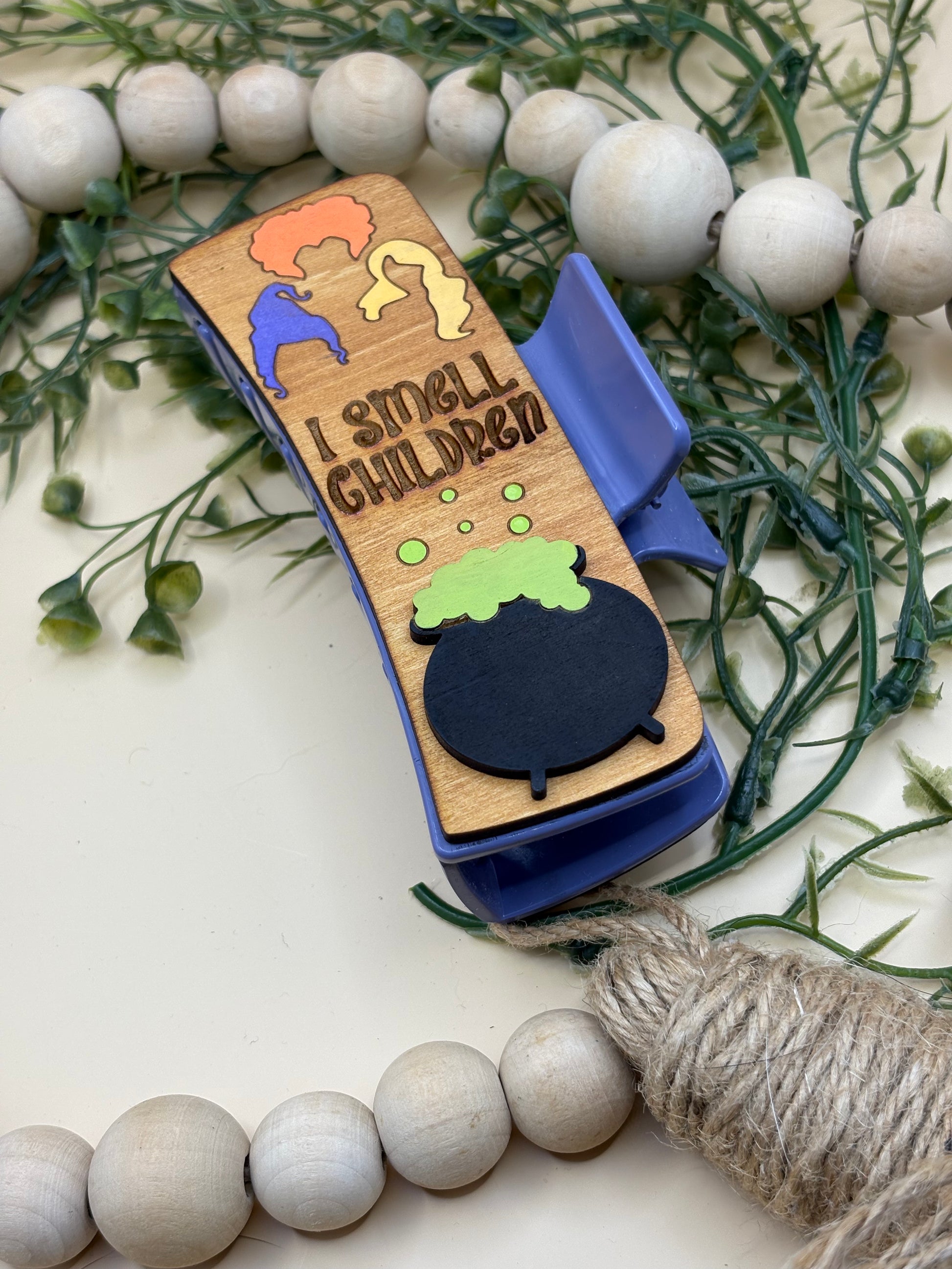 Introducing the I Smell Children Jumbo Claw Clip by PepperJack Designs! This delightful accessory is crafted from lightweight wood, ensuring comfort and ease of use. Each clip is handmade and hand-painted, showcasing the enchanting hair silhouettes of the Sanderson Sisters alongside a bubbling cauldron. The whimsical phrase "I Smell Children" is elegantly engraved, making it a perfect addition for fans of the beloved movie. Whether you're styling your hair for a special occasion or just adding a touch of magic to your everyday look, this claw clip is sure to turn heads and spark conversations!