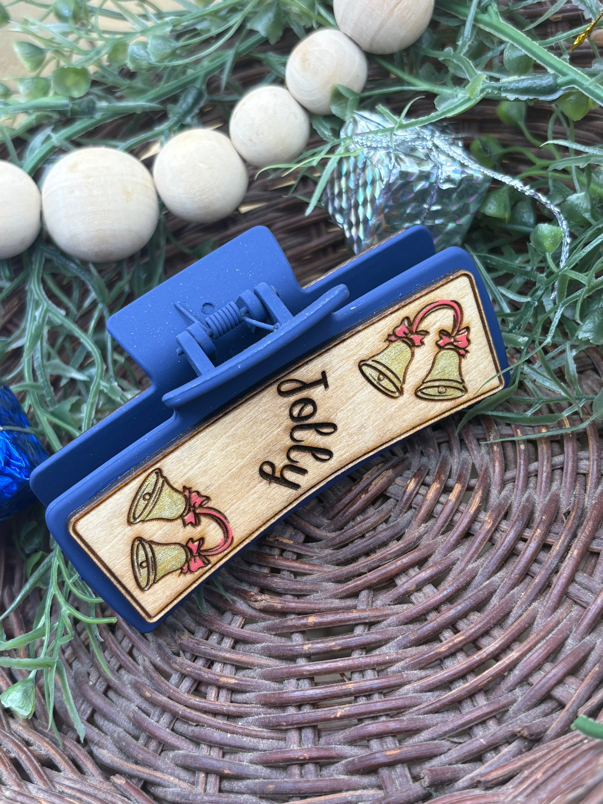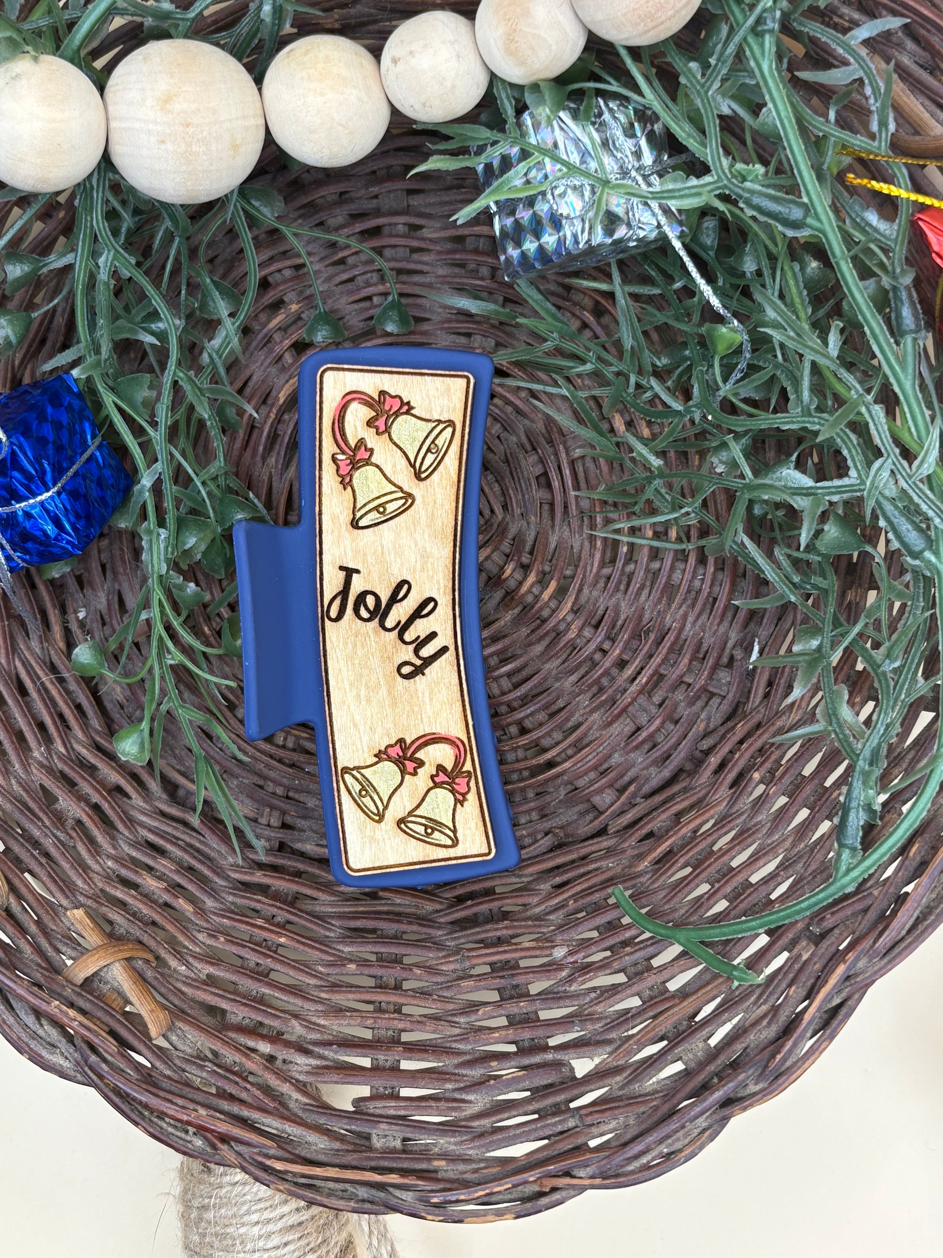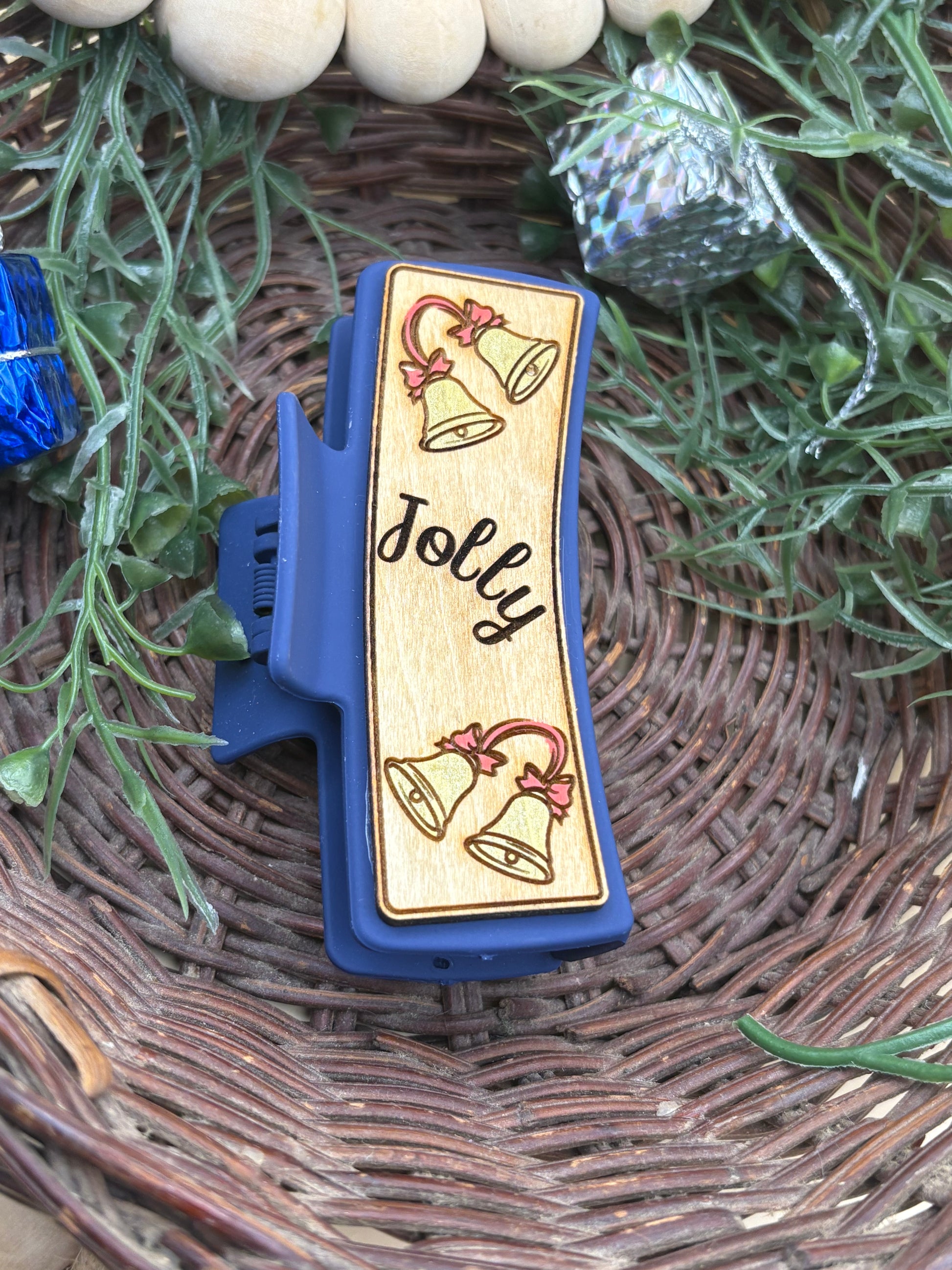 Jolly Bells Claw Clip by PepperJack Designs is a charming hair accessory crafted from lightweight wood. This hand-painted claw clip features festive gold bells with a red ribbon and the word "Jolly" engraved, delivering a cheerful holiday touch to any hairstyle. The compact, secure grip makes it ideal for everyday wear or festive occasions, while its durable finish stands up to daily use. Easy to care for and simple to wear, it adds a seasonal sparkle without weighing hair down.