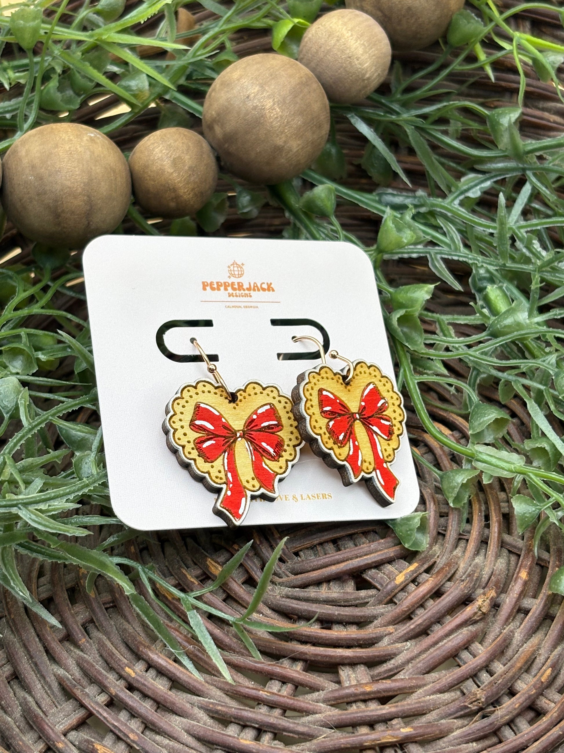 PepperJack Designs presents the Lace Doily Heart With Red Bow Earrings, a cheerful pair of lightweight, statement dangles that blend vintage lace charm with a playful red bow—perfect for Valentine's Day gifts, everyday romantic style, or just as a cute accent piece for any occasion. With a delicate openwork doily heart and a low weight that keeps them comfy all day, they pair beautifully with casual and dressy looks alike. Made from lightweight wood and hardware is medical grade hypoallergenic stainless steel.