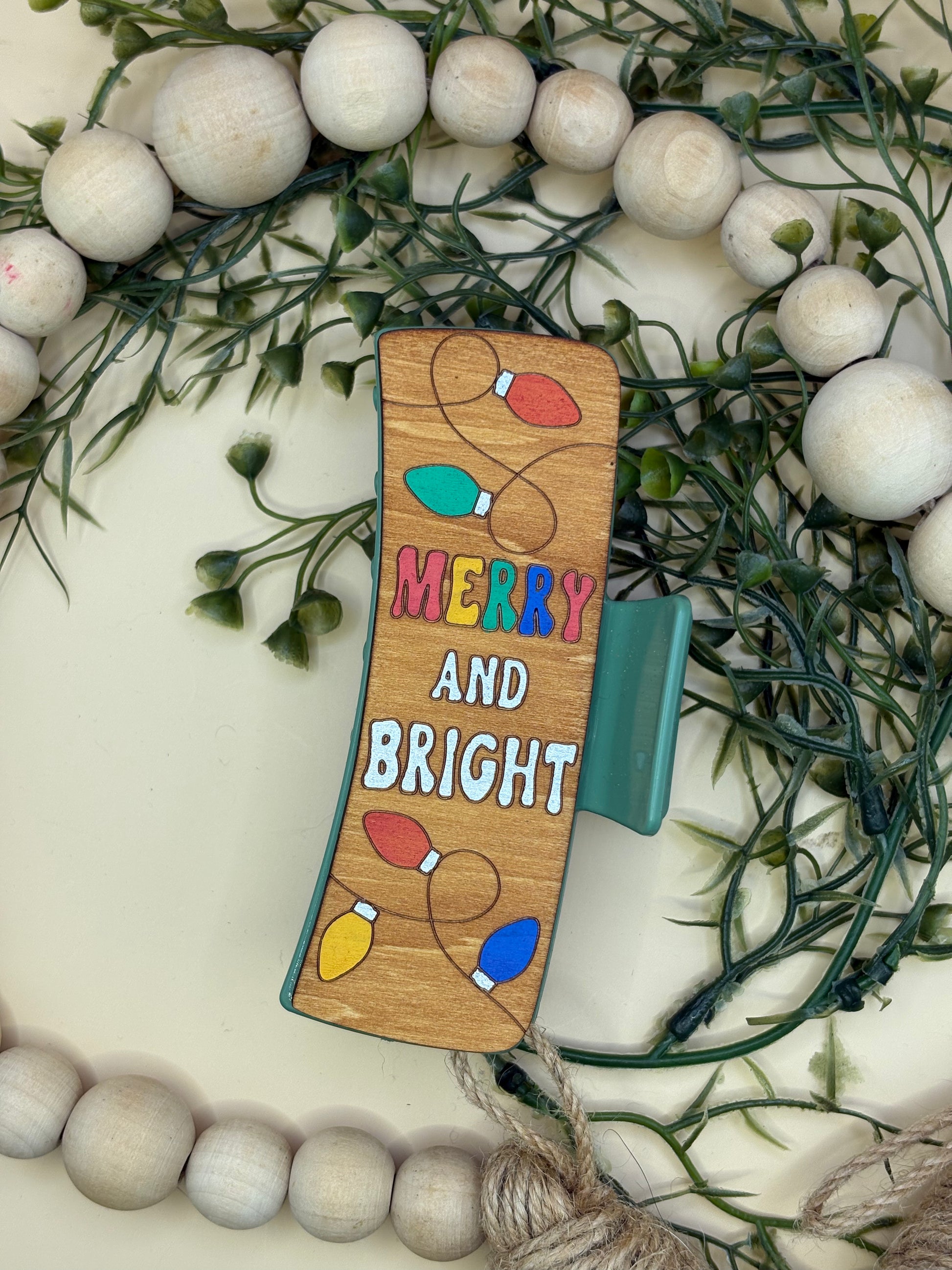 The Merry & Bright Claw Clip by PepperJack Designs is the perfect accessory to add a touch of festive cheer to your holiday look! Crafted from lightweight wood, this charming clip is not only functional but also a delightful statement piece. Each clip is handmade and hand-painted, showcasing a whimsical design featuring string Christmas lights and the cheerful phrase 'Merry And Bright.' Whether you're dressing up for a holiday party or just want to spread some joy, this claw clip is sure to brighten your day!
