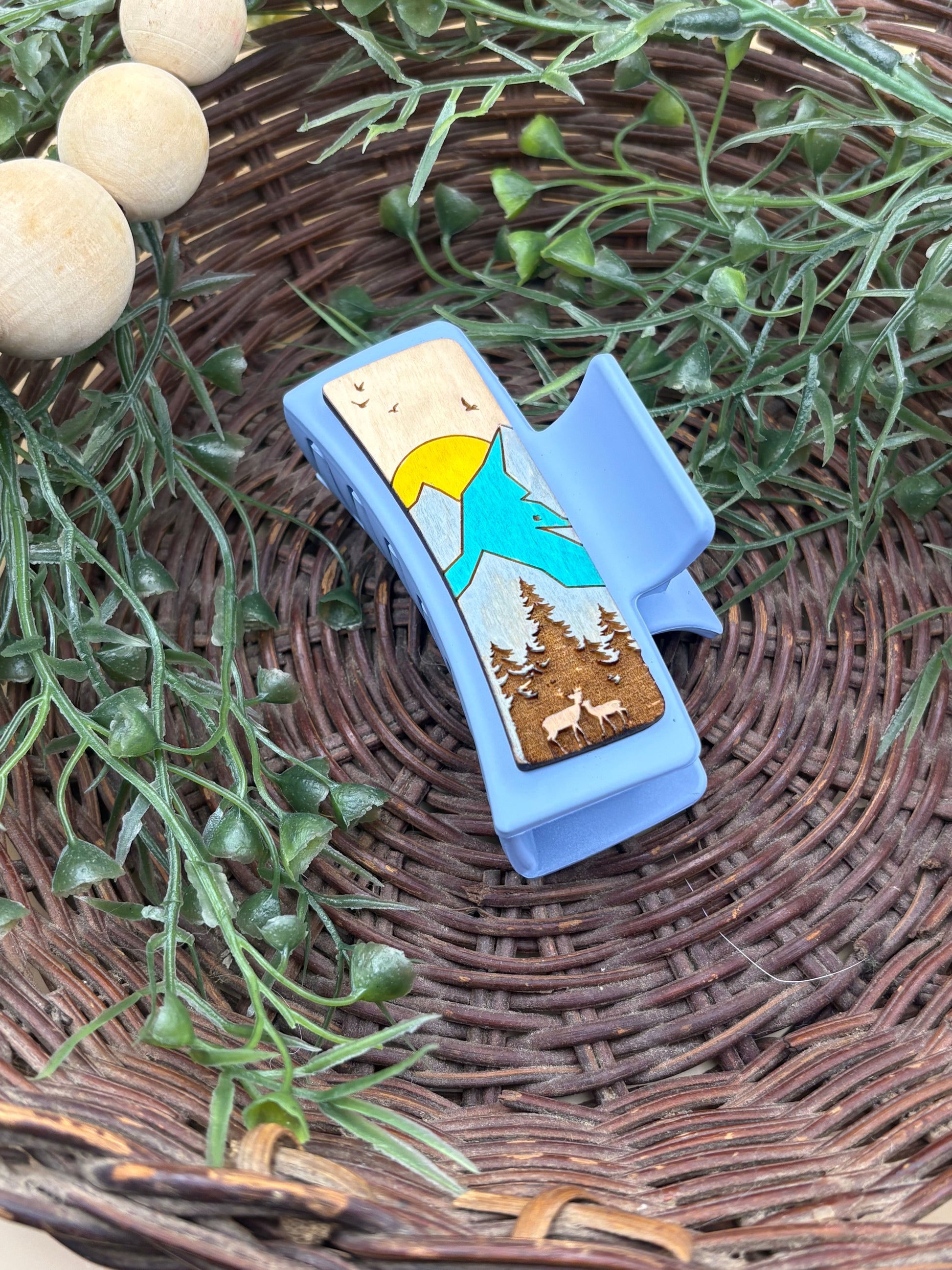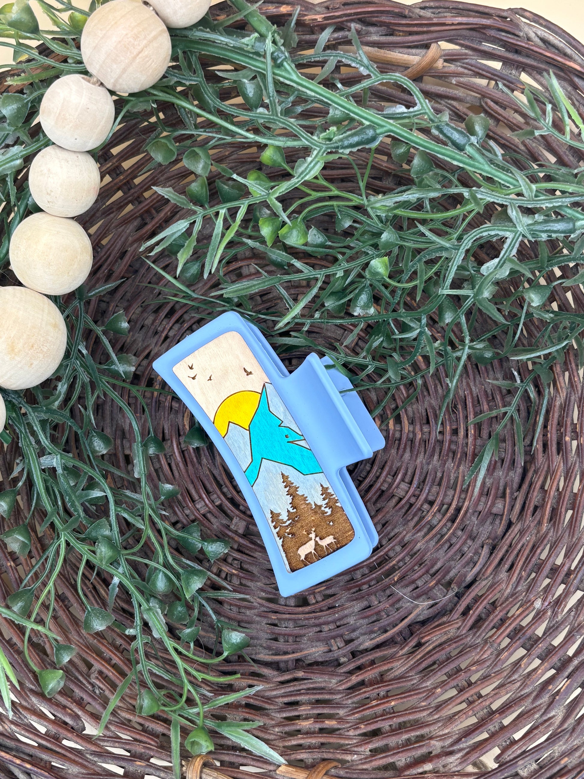 Mountains Small Claw Clip from PepperJack Designs is a lightweight wood hair clip crafted for everyday style and gentle hold. Handmade and hand-painted, this small claw clip features a detailed mountain landscape with a rising sun and deer in the foreground—an artful accent that works well for casual looks, quick updos, or as a thoughtful gift. The compact design makes it ideal for fine to medium hair or for securing partial styles; the claw mechanism offers easy one-handed use. Finished with care by PepperJack Designs, it blends artisanal charm with functional simplicity, perfect for anyone seeking a unique wood hair accessory or handmade claw clip