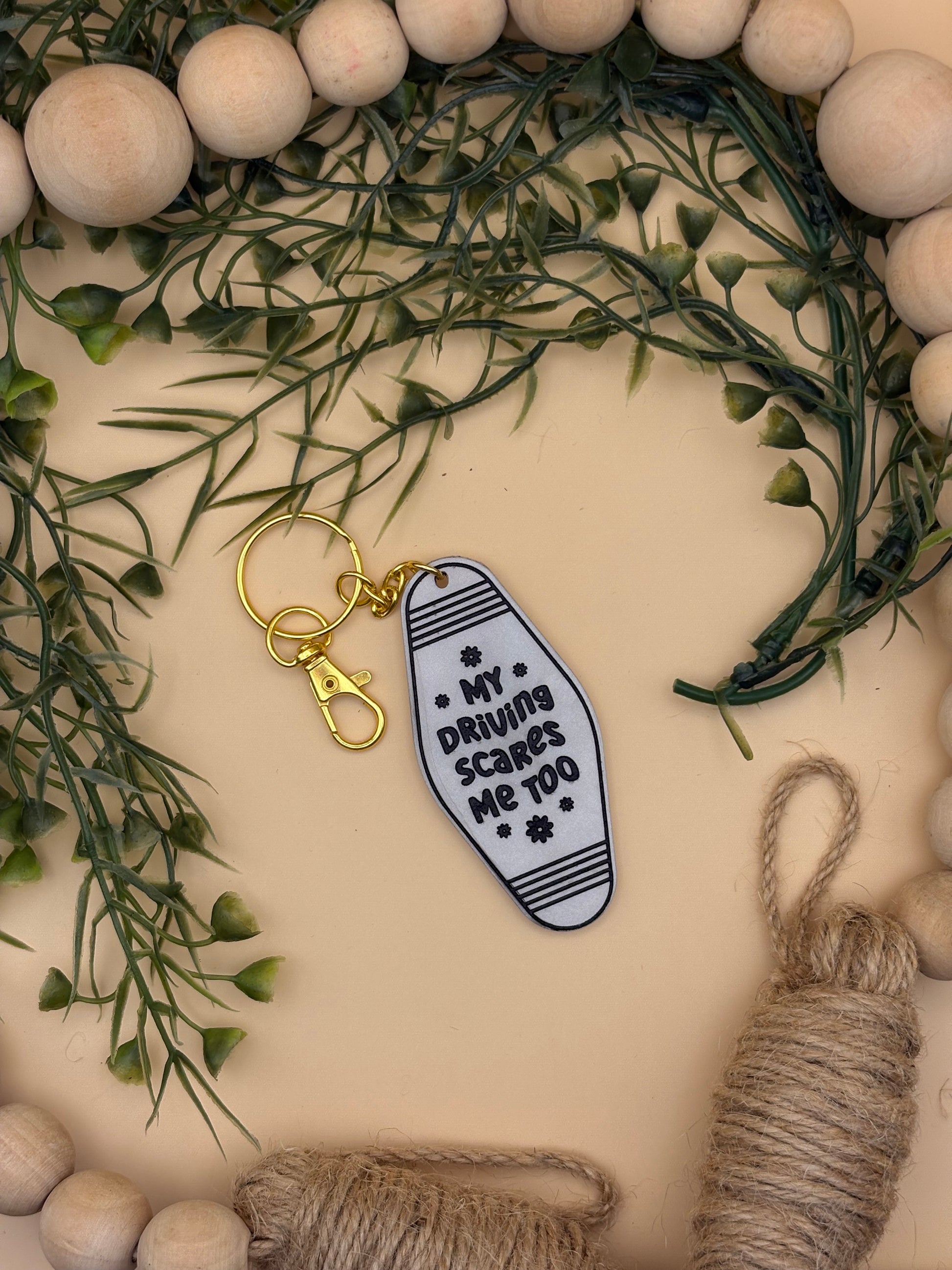 My Driving Scares Me Too Motel Style Keychain by PepperJack Designs