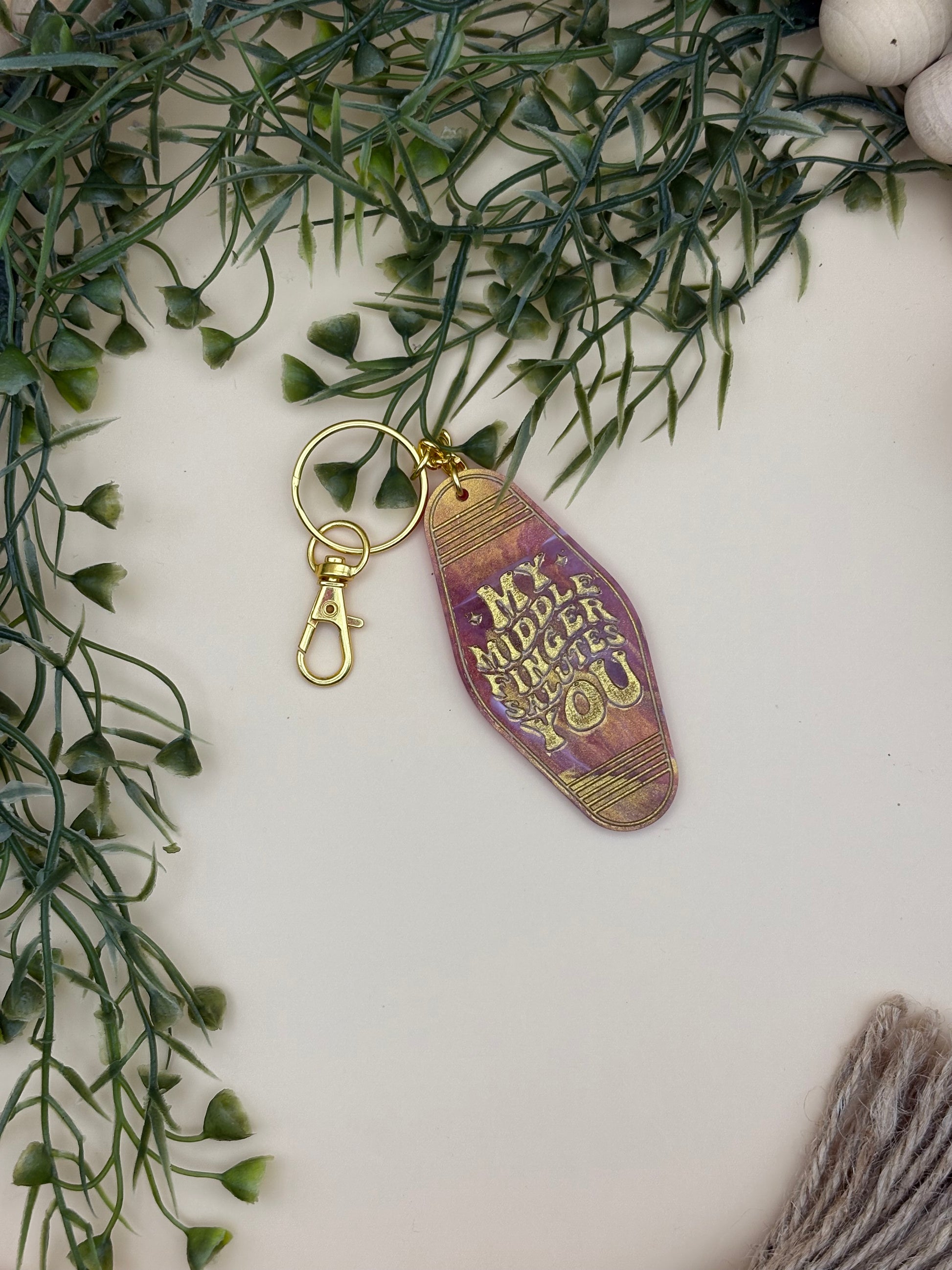 PepperJack Designs presents the delightful My Middle Finger Salutes You Motel Style Keychain, a perfect blend of humor and style! Crafted from vibrant red and gold swirl acrylic, this keychain features beautifully engraved and paint-filled gold lettering that stands out. It's not just a keychain; it's a fun statement piece that adds personality to your keys or bag. Whether you're treating yourself or looking for a quirky gift for a friend, this keychain is sure to bring a smile and a touch of sass to anyone's day!