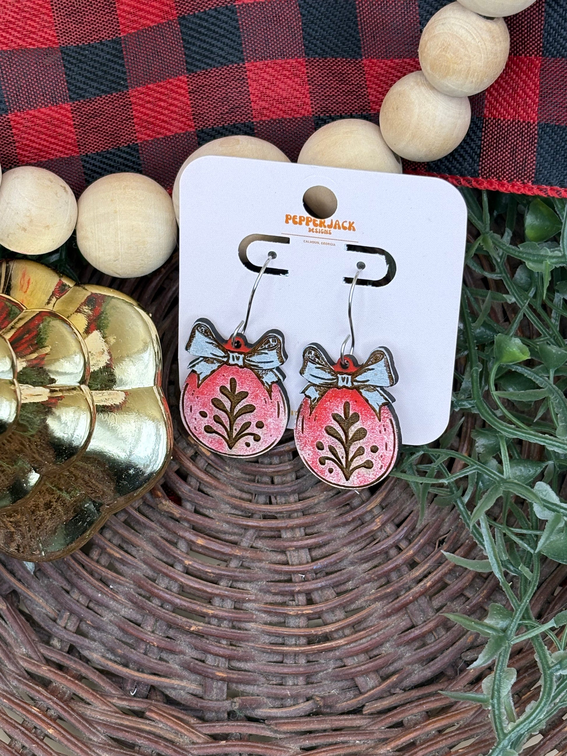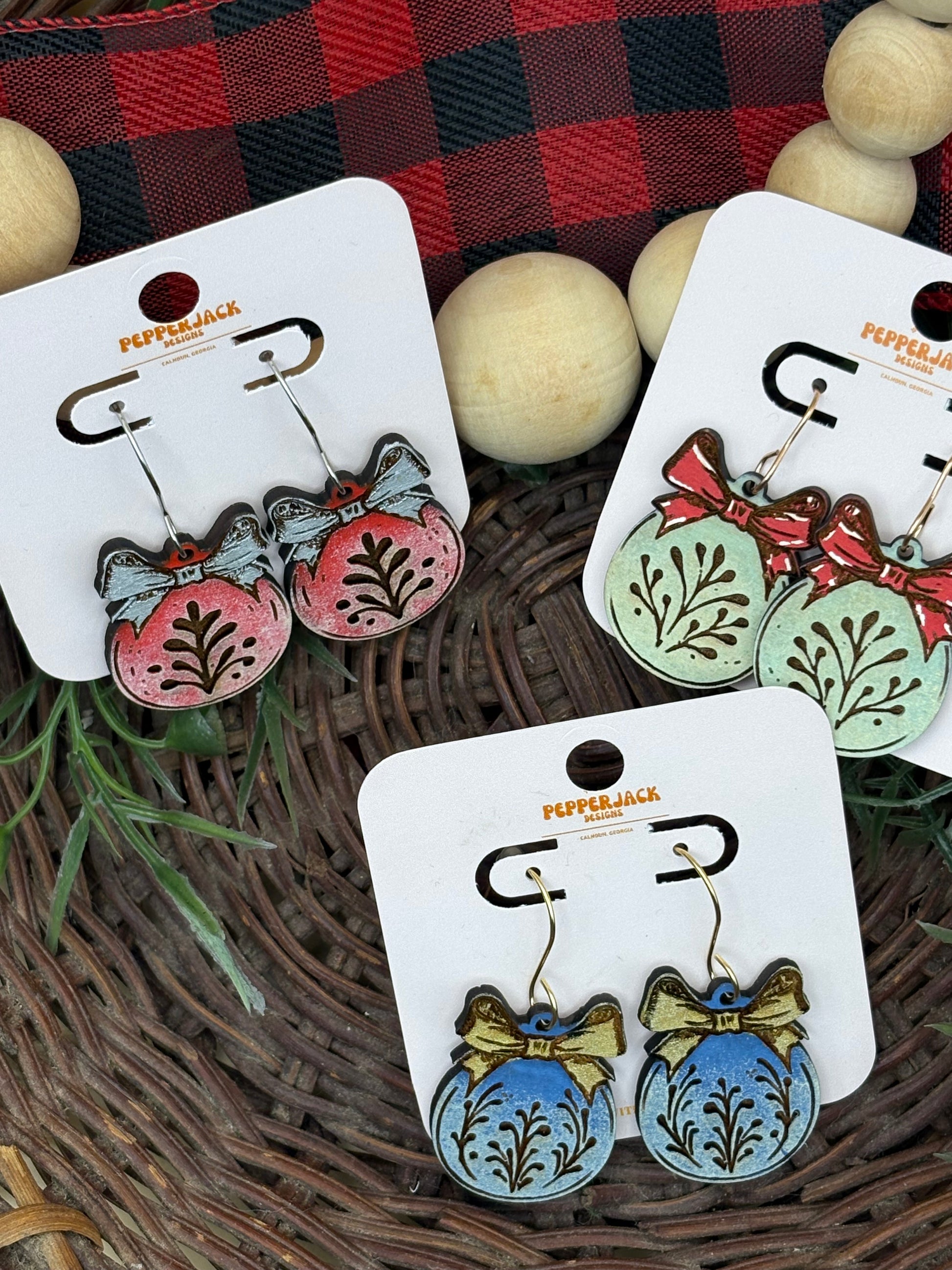 PepperJack Designs presents the Ornaments With Bows Earrings — lightweight, handcrafted wooden earrings with cheerful holiday charm. Each pair is handmade and hand-painted, featuring an engraved bow motif and available in three distinct ornament styles: Red Ornament with Silver Bow, Blue Ornament with Gold Bow, and Green Ornament with Red Bow. These earrings use hypoallergenic stainless steel hardware for comfortable wear. Bright, festive, and easy to style, they make a delightful seasonal accent or a thoughtful gift for someone who loves unique, artisanal jewelry.