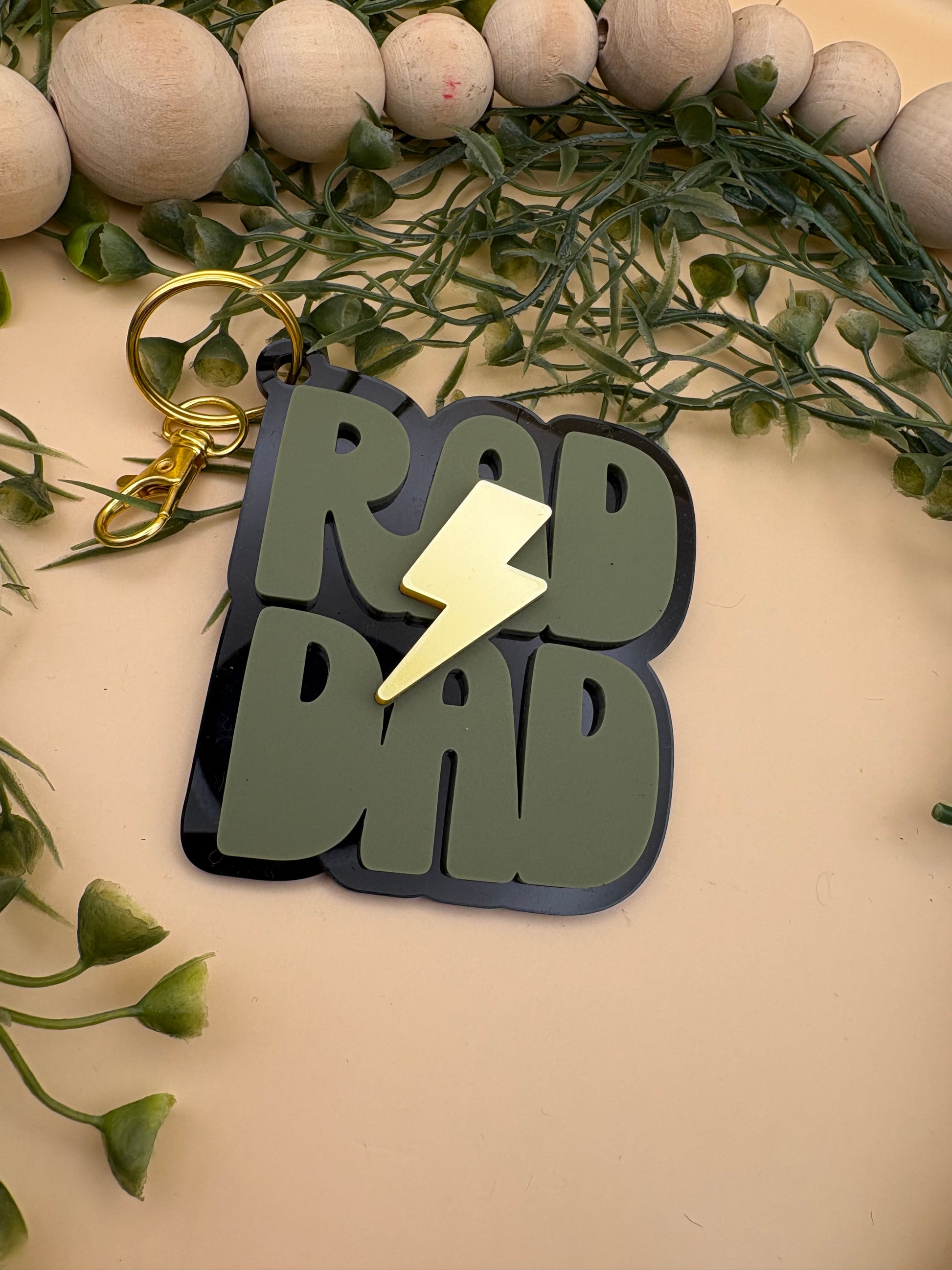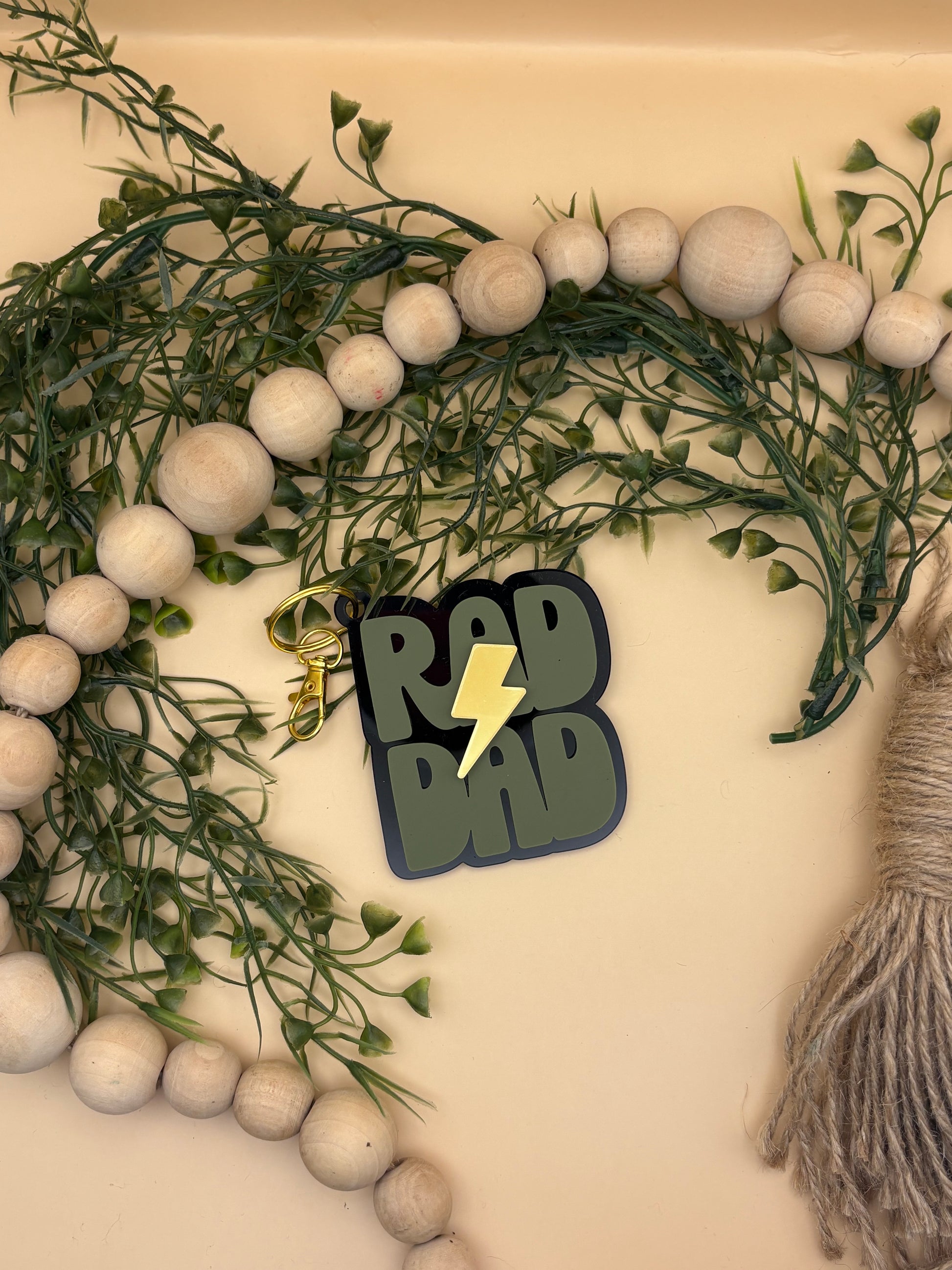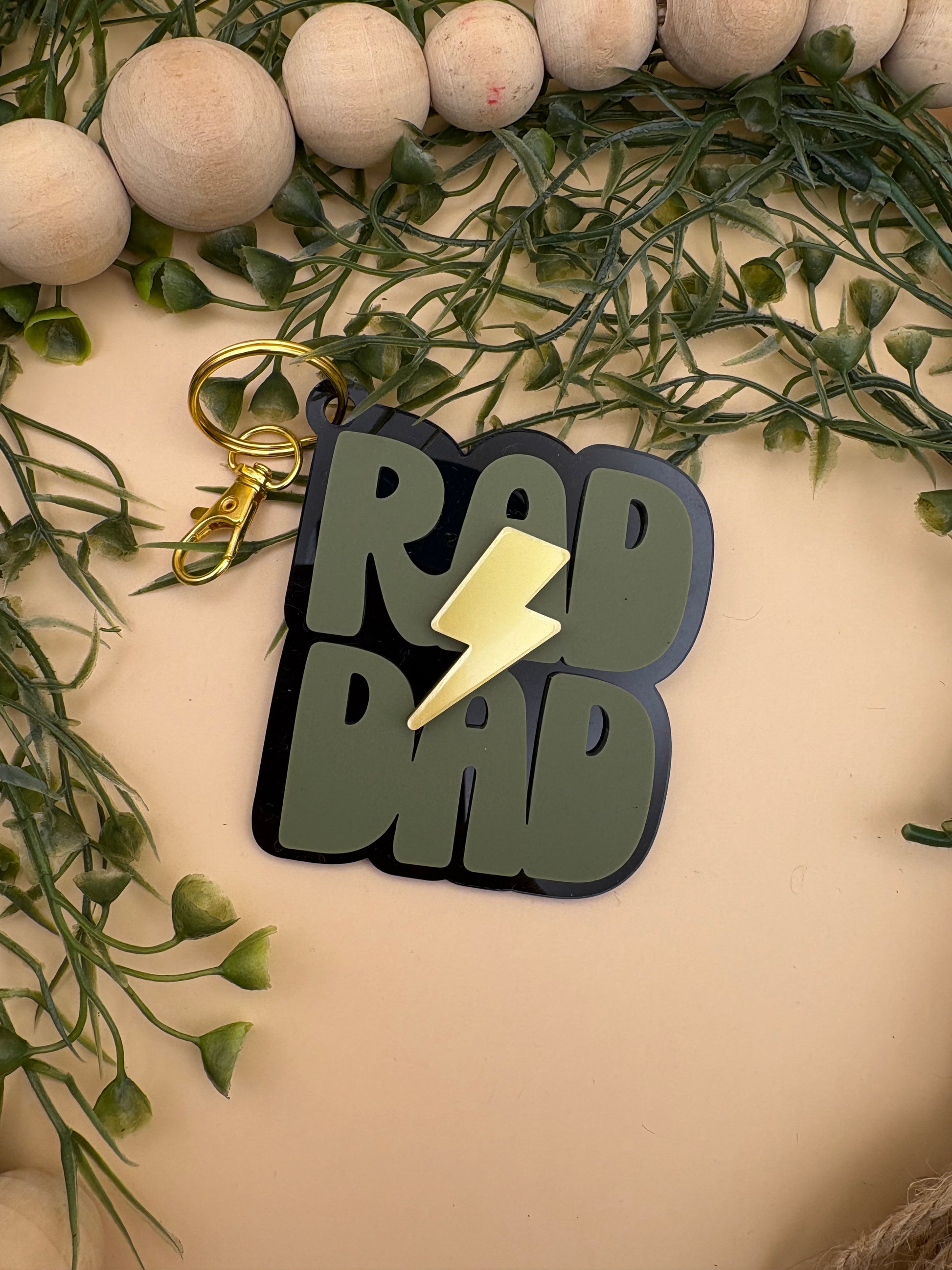 The Rad Dad Keychain by PepperJack Designs is a stylish and functional accessory that every dad will love! Crafted with a bottom layer of sleek black acrylic, it features the words 'Rad Dad' in a vibrant olive green acrylic, topped off with a striking lightning bolt made from mirrored gold acrylic. This lightweight yet durable keychain is not only a practical item for holding keys but also a fun statement piece that showcases a dad's personality.