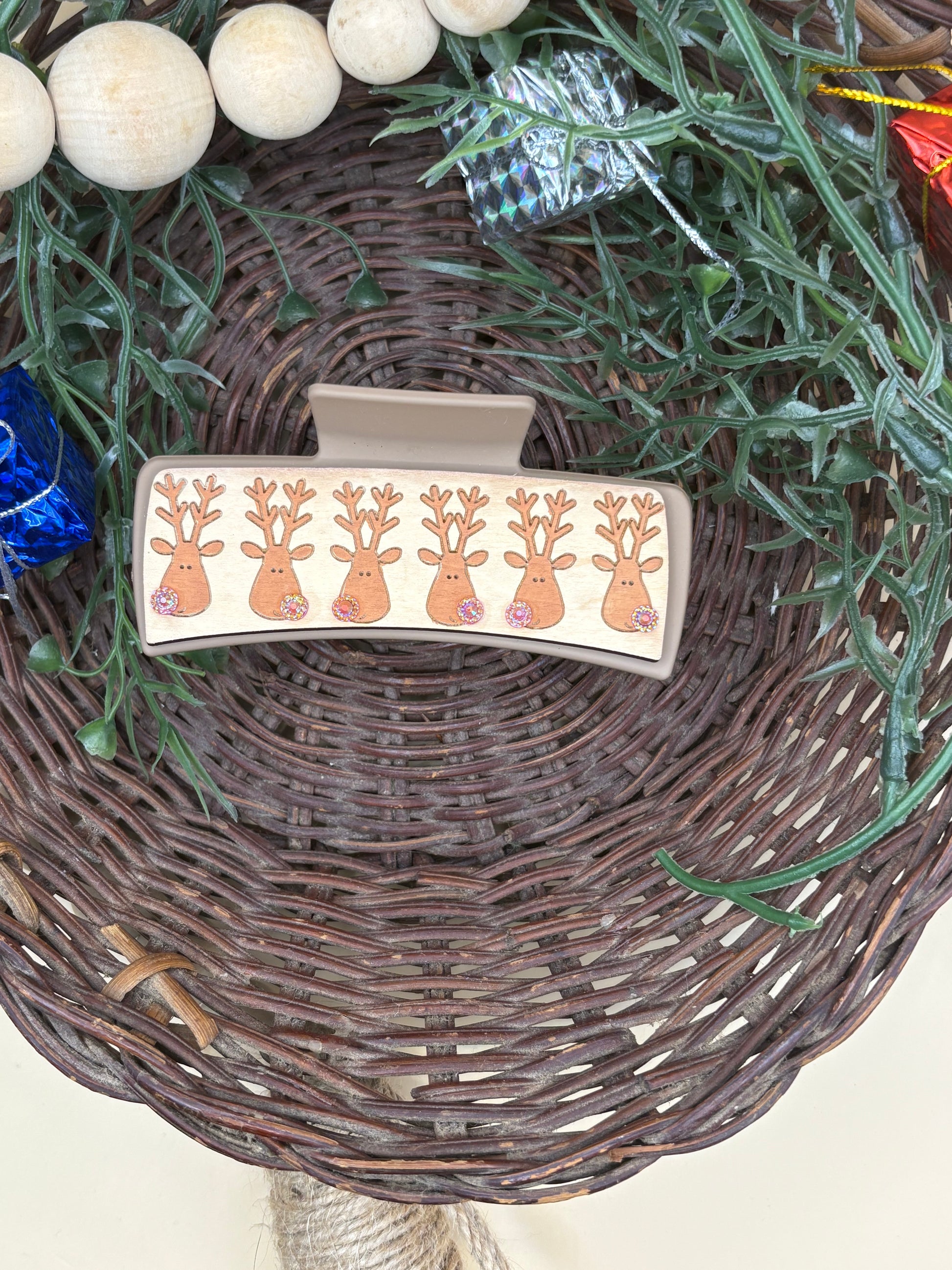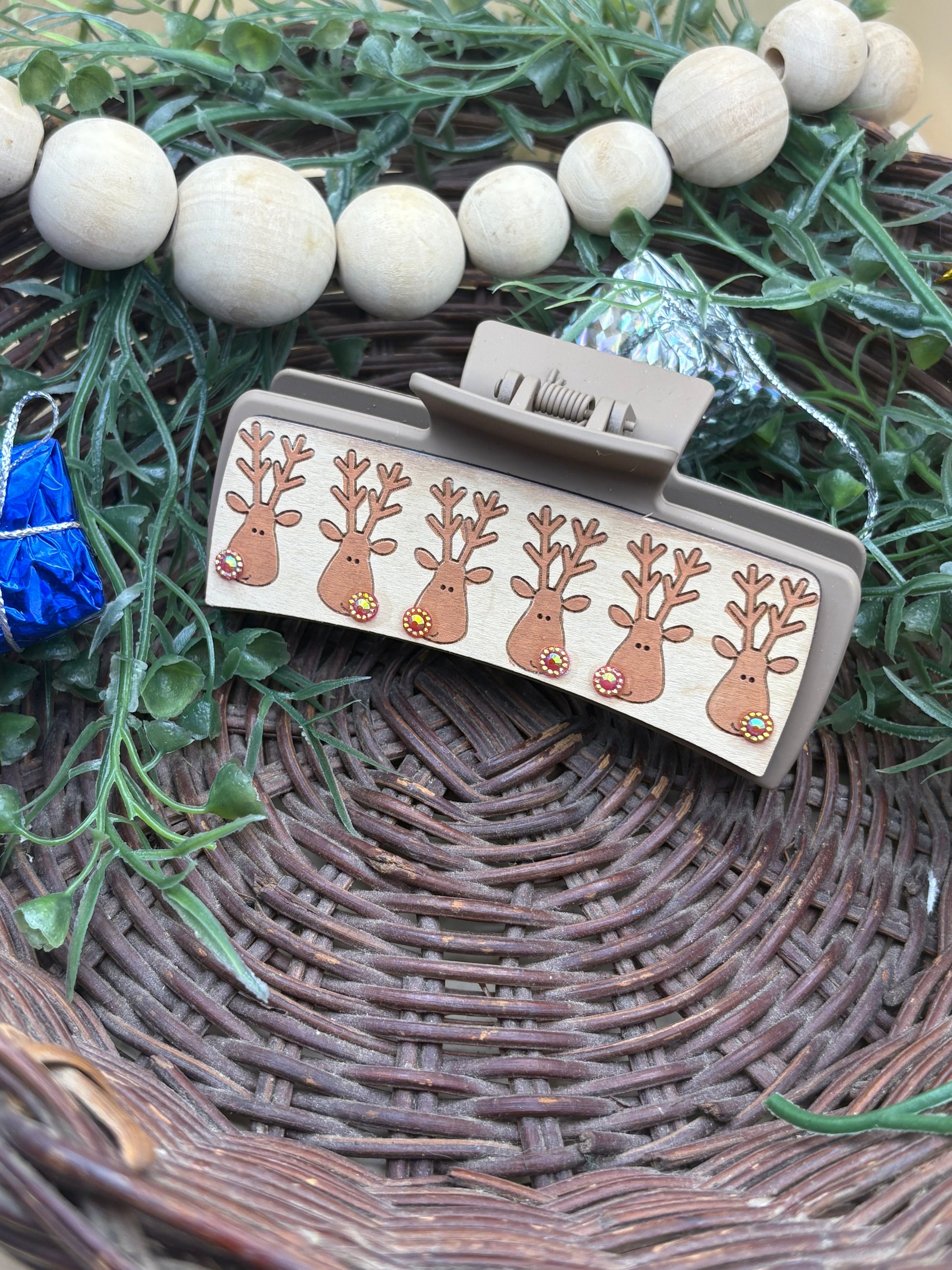 PepperJack Designs' Reindeer Claw Clip is a charming, festive hair accessory handcrafted to bring holiday cheer to any look. Made from lightweight wood and lovingly handmade and hand painted, each clip features a playful reindeer motif accented with a sparkling red jewel for an eye-catching touch. Its compact, lightweight design makes it easy to wear for seasonal parties, family gatherings, or as a merry finishing touch for everyday winter style. Perfect as a stocking stuffer or holiday gift, this clip adds instant festive spirit while showcasing artisan craftsmanship from PepperJack Designs.