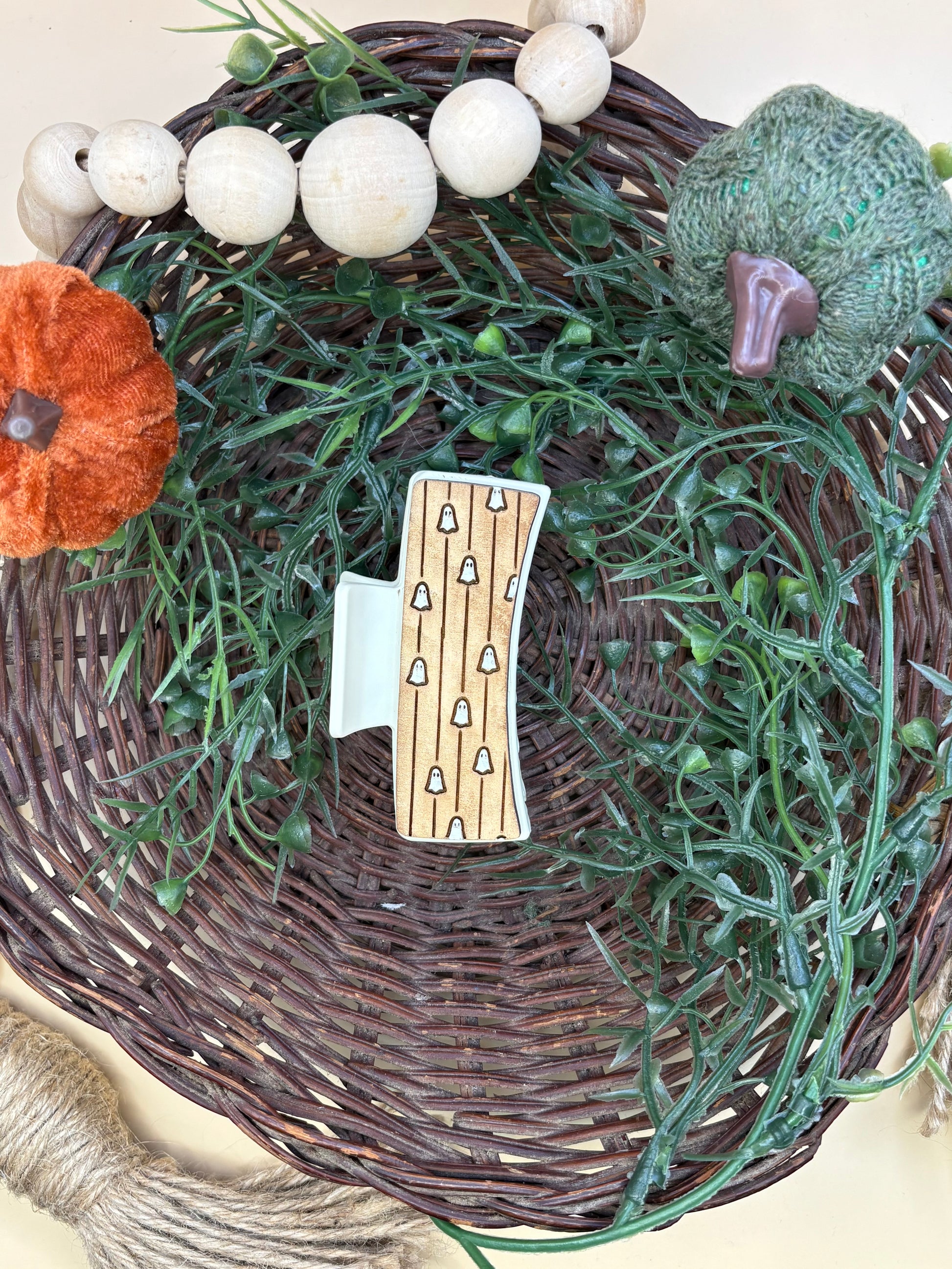PepperJack Designs presents the Rustic Ghost Striped Small Claw Clip — a lightweight, handmade wooden hair clip that adds a playful, rustic touch to your Fall and Halloween looks. This small claw clip is hand painted with ghost and stripe motifs for a charming, spooky-season aesthetic that pairs perfectly with cozy sweaters, seasonal parties, or everyday wear. The compact 3.4-inch size keeps hair secure while remaining comfortable for all-day use. Finished with a rustic look, it’s a delightful accent for those who love festive, handcrafted accessories.