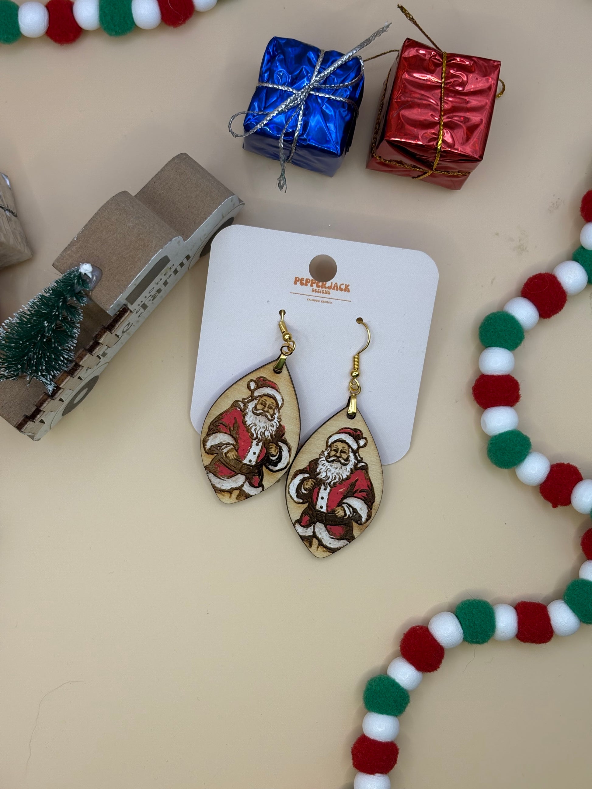 Santa Earrings by PepperJack Designs are the perfect festive accessory to brighten up your holiday season! Crafted from lightweight wood, these earrings are not only comfortable to wear but also showcase exquisite handmade artistry. Each pair features a beautifully engraved and hand-painted Santa, capturing the spirit of Christmas in stunning detail. Whether you're dressing up for a holiday party or looking for a charming gift, these earrings are sure to spread joy and cheer!