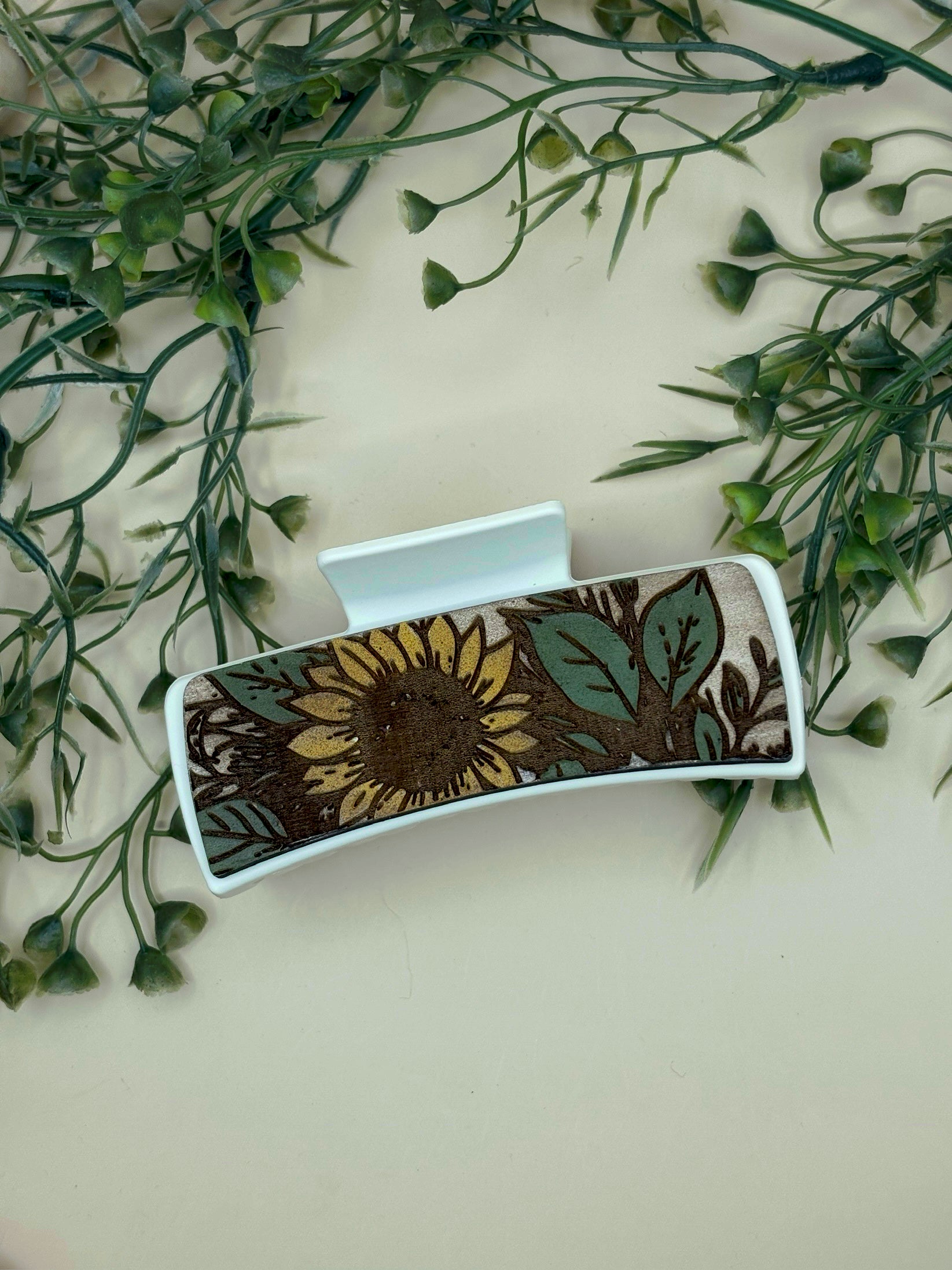 PepperJack Designs Sunflower Claw Clip is a lightweight wooden hair accessory that brings a sunny, boho flair to everyday styling. Handmade and hand painted, this claw clip features engraved sunflower motifs on wood for a tactile, artisanal finish. The compact 4.1-inch clip length makes it suitable for a variety of hair types and casual updos—ideal for adding a cheerful accent to ponytails, half-up styles, or loose buns. Care is simple: handle gently and avoid prolonged exposure to water or harsh chemicals to preserve the hand-painted finish.