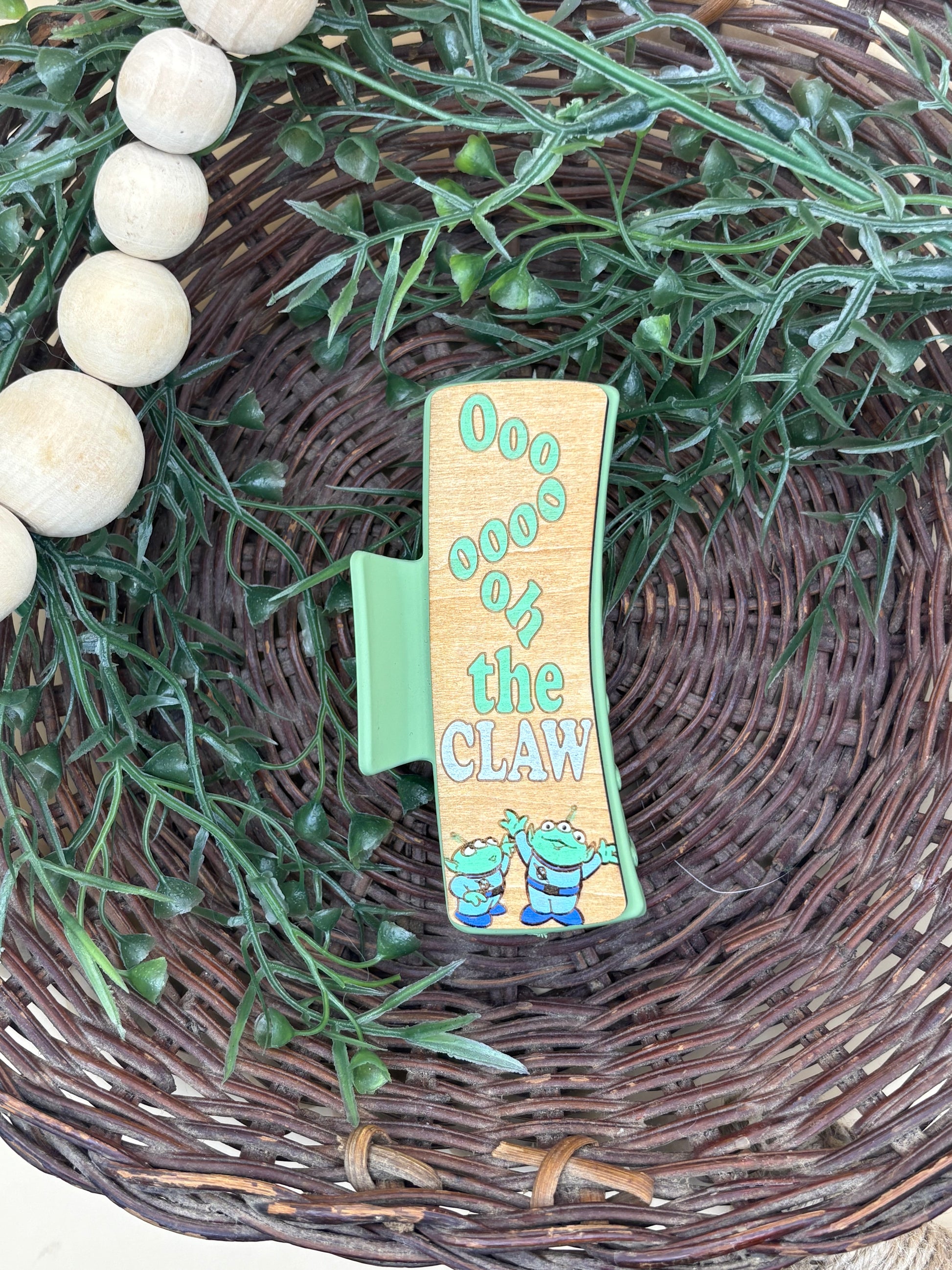PepperJack Designs offers the Toy Story Aliens "The Claw" Hair/Claw Clip—a lightweight wooden accessory that adds playful Disney charm to everyday looks. Handcrafted and hand painted, this clip features the three Aliens gazing upward with the caption "OOooooh The Claw," delivering a cheerful statement piece for Toy Story fans. Its wood construction keeps the clip light for comfortable wear, while hand-finished details give each piece a unique artisanal touch. Perfect for adding a whimsical accent to casual outfits, ponytails, or half-up styles, it also makes a delightful gift for Disney lovers and collectors.