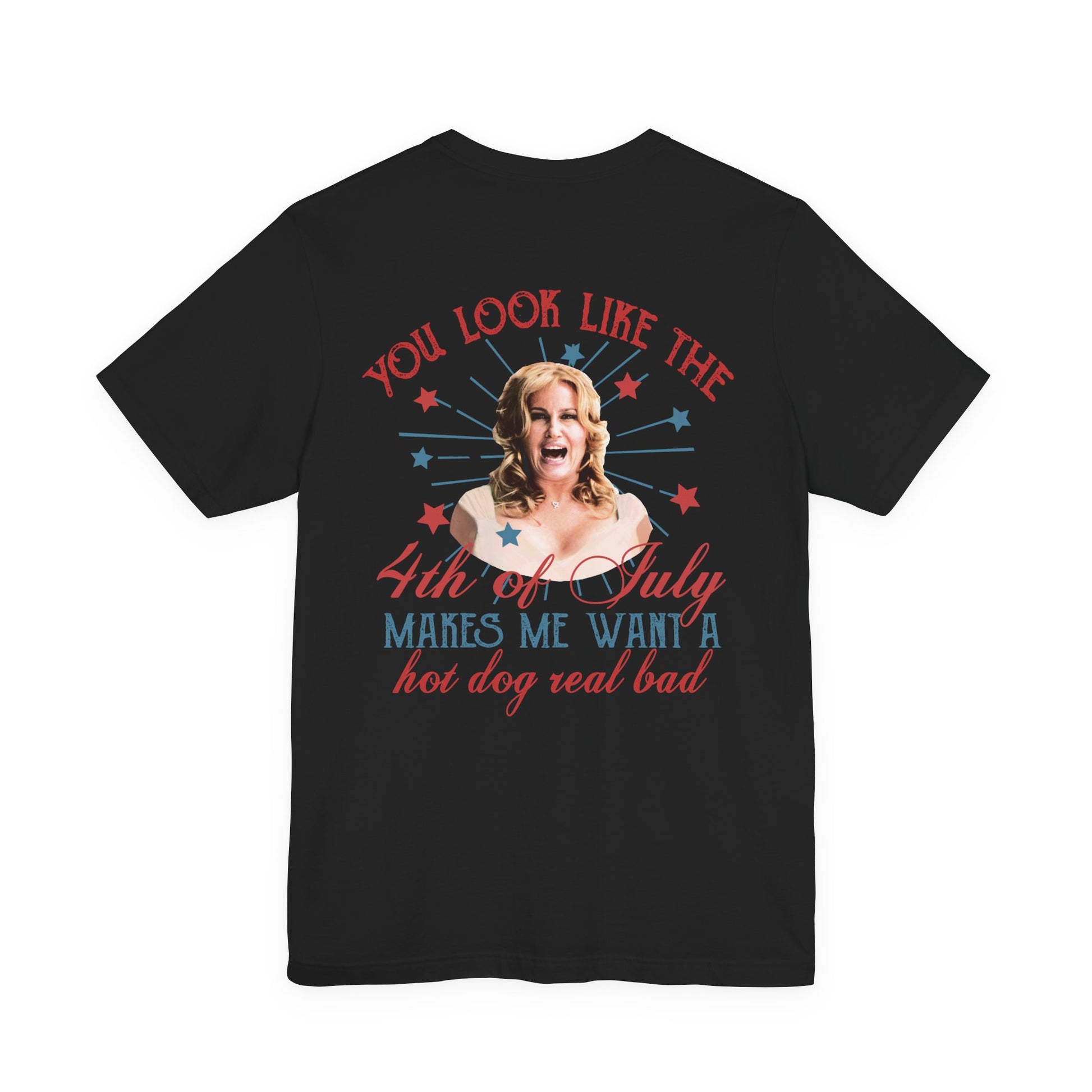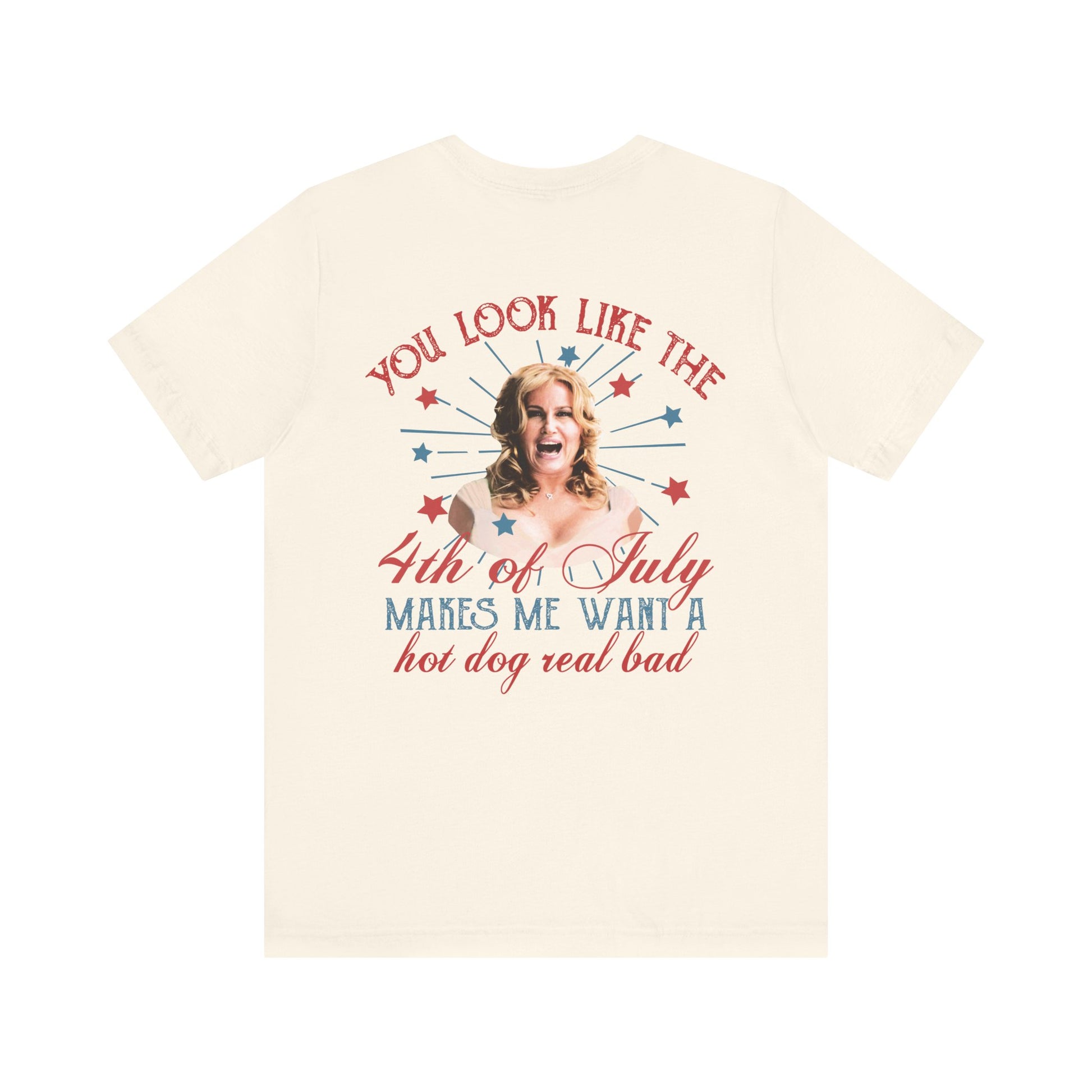 Introducing the "You Look Like the 4th of July" Bella Canvas T-shirt, inspired by the fabulous Jennifer Coolidge! This delightful shirt showcases her iconic quote, "Makes me want a hotdog real bad," making it a must-have for fans of pop culture and humor. Perfect for casual outings, movie nights, or simply lounging in style, this T-shirt is designed to bring a smile to your face.